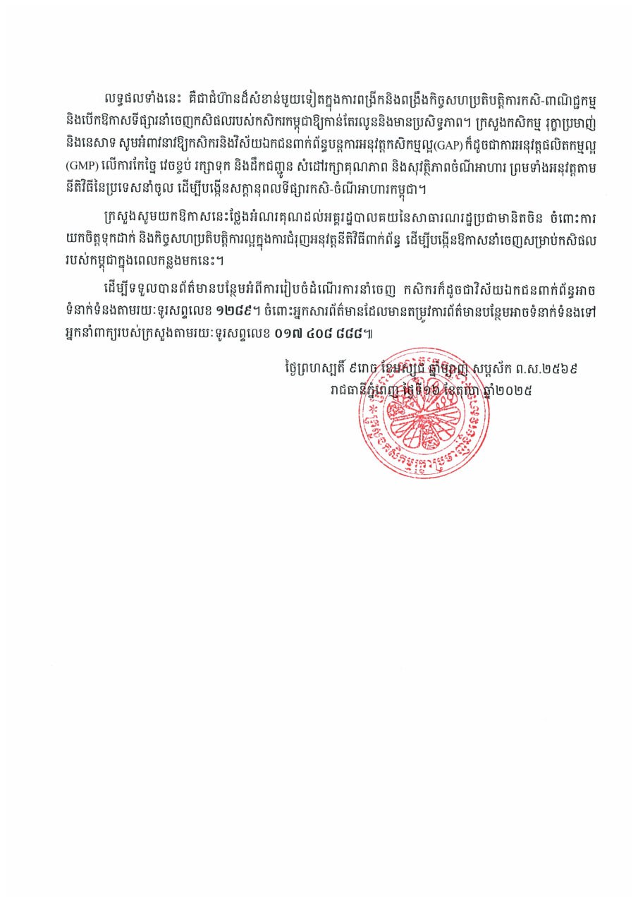 ដើម្បីទទួលបានព័ត៌មានបន្ថែមអំពីការរៀបចំដំណើរការនាំចេញ កសិករក៏ដូចជាវិស័យឯកជនពាក់ព័ន្ធអាច ទំនាក់ទំនងតាមរយៈទូរសព្ទលេខ ១២៨៩។ ចំពោះអ្នកសារព័ត៌មានដែលមានតម្រូវការព័ត៌មានបន្ថែមអាចទំនាក់ទំនងទៅ អ្នកនាំពាក្យរបស់ក្រសួងតាមរយៈទូរសព្ទលេខ ០១៧ ៤០៨ ៨៨៨៕