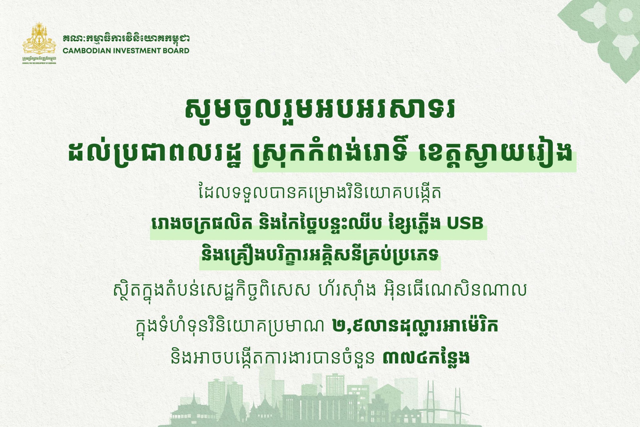 (ខេត្តស្វាយរៀង)៖ កាលពីថ្ងៃទី ១៩ ខែតុលា ឆ្នាំ ២០២៥ ក្រុមប្រឹក្សាអភិវឌ្ឍន៍កម្ពុជា បានឱ្យដឹងថា គម្រោងវិនិយោគរោងចក្រអេឡិកត្រូនិក ទទួលបានការអនុញាតអោយបង្កើតនៅស្រុកកំពង់រោទិ៍ ខេត្តស្វាយរៀង។