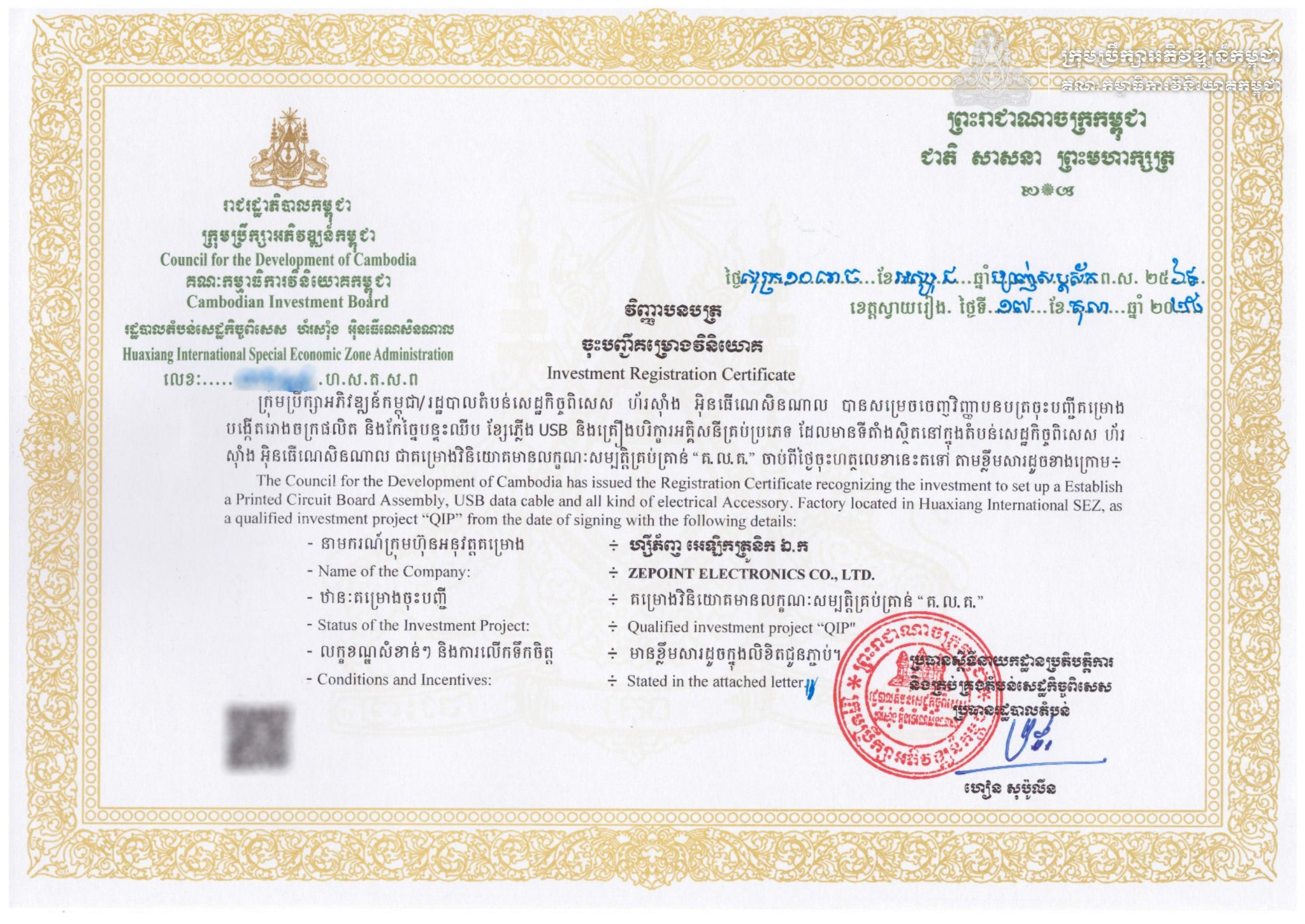 ចំពោះគម្រោងវិនិយោគនេះដែរ ផ្តោតទៅលើការបង្កើតរោងចក្រសម្រាប់ផលិត និងកែច្នៃបន្ទះឈីប ខ្សែភ្លើង USB និងគ្រឿងបរិក្ខារអគ្គិសនីគ្រប់ប្រភេទផ្សេងទៀត៕