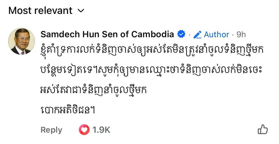តាមរយៈការបញ្ចេញយោបល់ក្នុងការផ្សាយក្នុងគេហទំព័រការងារផ្លូវការរបស់ខ្លួន នៅយប់ថ្ងៃទី២០ ខែតុលា ឆ្នាំ២០២៥ម្សិលមិញនេះ សម្តេចតេជោ ប្រធានព្រឹទ្ធសភា បានសង្កត់ធ្ងន់ថា «សូមកុំឲ្យមានឈ្មោះថាទំនិញចាស់លក់មិនចេះអស់ តែវាជាទំនិញនាំចូលថ្មីមក ដែល បោកអតិថិជន»។