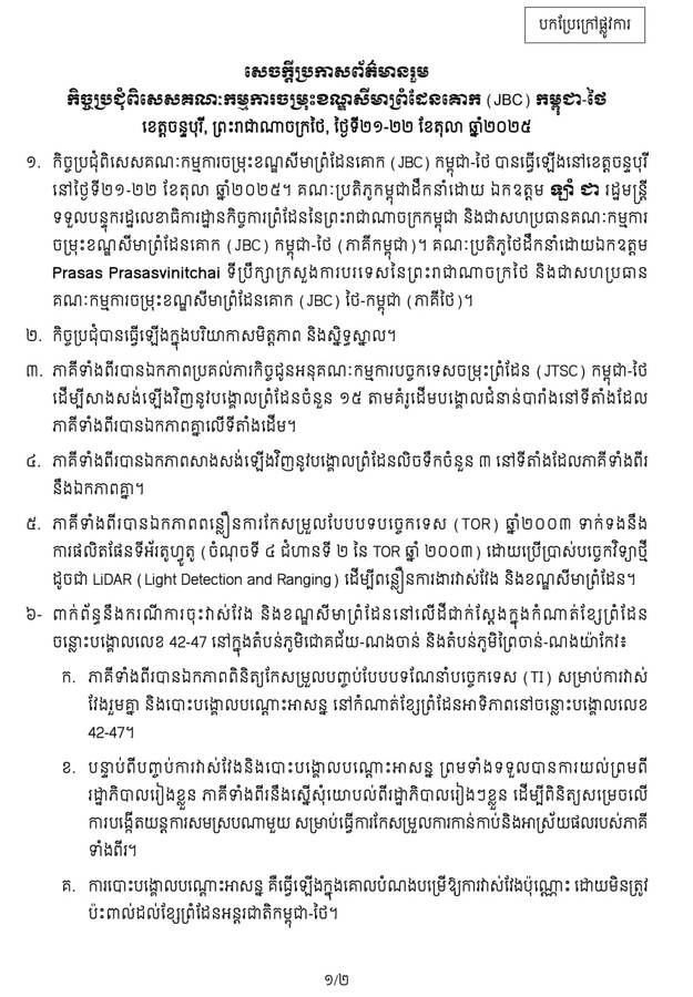 នៅកិច្ចប្រជុំពិសេសគណៈកម្មការចម្រុះខណ្ឌសីមាព្រំដែនគោក (JBC) កម្ពុជា-ថៃ ខេត្តចន្ទបុរី ព្រះរាជាណាចក្រថៃ ថ្ងៃទី ២១ ដល់ថ្ងៃទី ២២ ខែតុលា ឆ្នាំ ២០២៥ រយៈពេលពីរថ្ងៃ បានបញ្ចប់ដោយបរិយាកាសមិត្តភាព និងស្និទ្ធស្នាល។ នេះបើយោងតាមសេចក្តីប្រកាសព័ត៌មានរួមកិច្ចប្រជុំ។