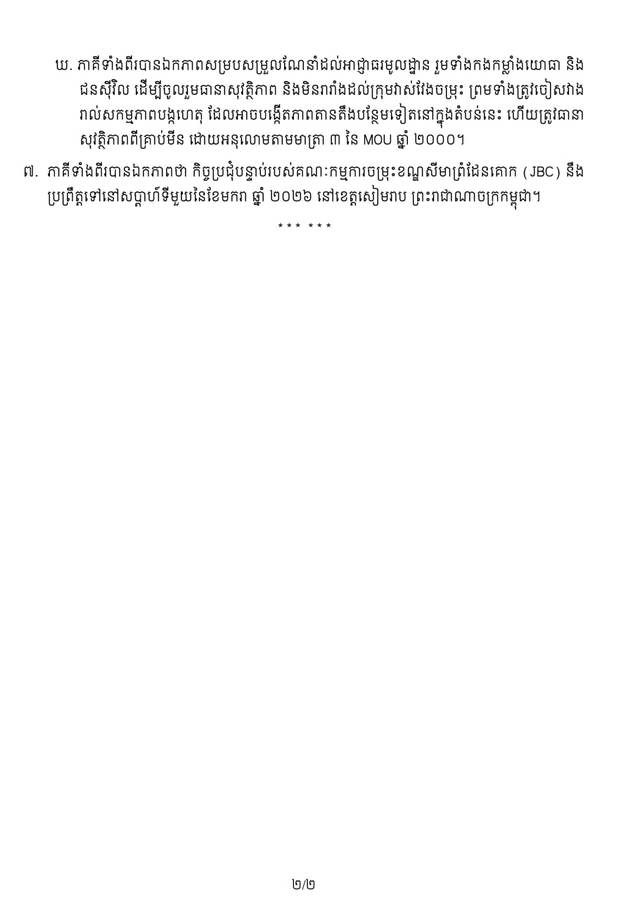 ភាគីទាំងពីរបានឯកភាពថា កិច្ចប្រជុំបន្ទាប់របស់គណៈកម្មការចម្រុះខណ្ឌសីមាព្រំដែនគោក (JBC) នឹង ប្រព្រឹត្តទៅនៅសប្តាហ៍ទីមួយនៃខែមករា ឆ្នាំ ២០២៦ នៅខេត្តសៀមរាប ព្រះរាជាណាចក្រកម្ពុជា៕
