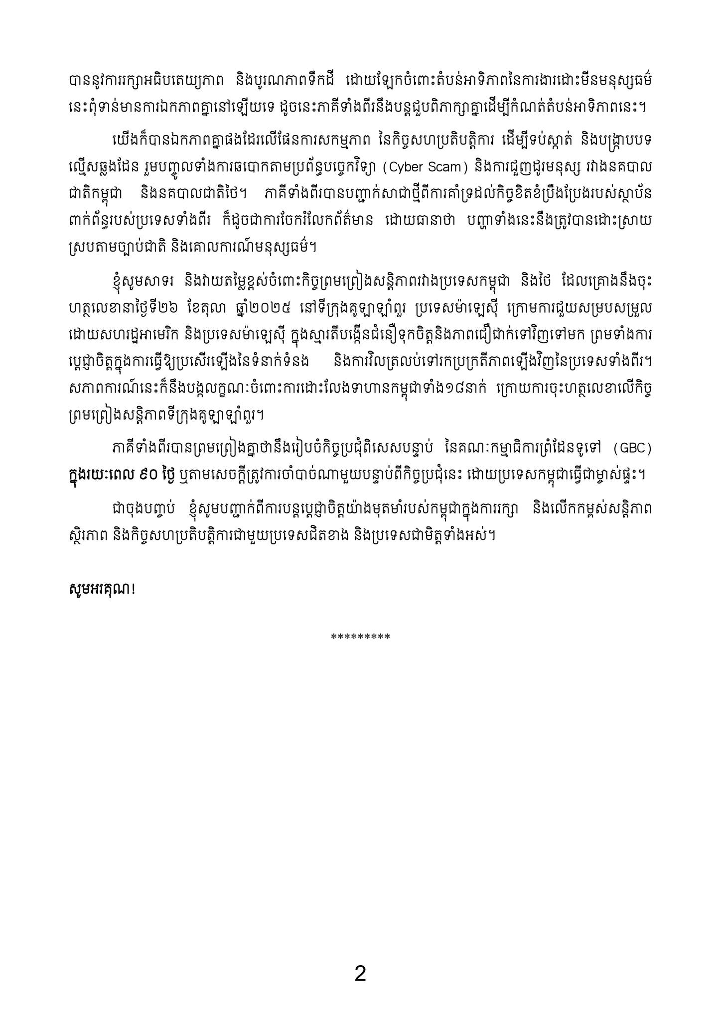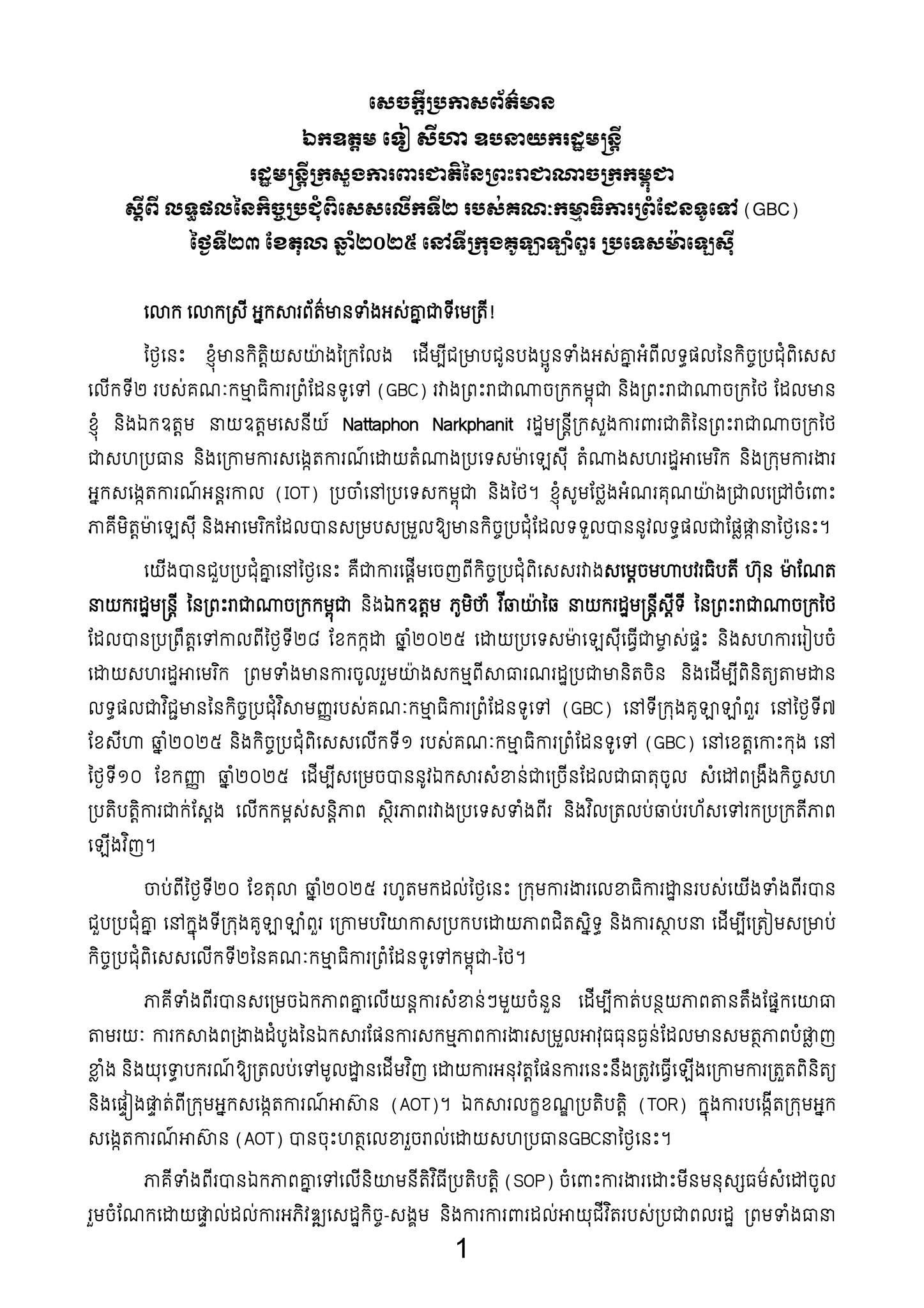 យើងបានជួបប្រជុំគ្នានៅថ្ងៃនេះ គឺជាការផ្តើមចេញពីកិច្ចប្រជុំពិសេសរវាងសម្តេចមហាបវរធិបតី ហ៊ុន ម៉ាណែត នាយករដ្ឋមន្ត្រី នៃព្រះរាជាណាចក្រកម្ពុជា និងឯកឧត្តម ភូមិថាំ វីឆាយ៉ាឆៃ នាយករដ្ឋមន្ត្រីស្តីទី នៃព្រះរាជាណាចក្រថៃ ដែលបានប្រព្រឹត្តទៅកាលពីថ្ងៃទី២៨ ខែកក្កដា ឆ្នាំ២០២៥ ដោយប្រទេសម៉ាឡេស៊ីធ្វើជាម្ចាស់ផ្ទះ និងសហការរៀបចំ ដោយសហរដ្ឋអាមេរិក ព្រមទាំងមានការចូលរួមយ៉ាងសកម្មពីសាធារណរដ្ឋប្រជាមានិតចិន និងដើម្បីពិនិត្យតាមដាន លទ្ធផលជាវិជ្ជមាននៃកិច្ចប្រជុំវិសាមញ្ញរបស់គណៈកម្មាធិការព្រំដែនទូទៅ (GBC) នៅទីក្រុងគូឡាឡាំពួរ នៅថ្ងៃទី៧ ខែសីហា ឆ្នាំ២០២៥ និងកិច្ចប្រជុំពិសេសលើកទី១ របស់គណៈកម្មាធិការព្រំដែនទូទៅ (GBC) នៅខេត្តកោះកុង នៅ ថ្ងៃទី១០ ខែកញ្ញា ឆ្នាំ២០២៥ ដើម្បីសម្រេចបាននូវឯកសារសំខាន់ជាច្រើនដែលជាធាតុចូល សំដៅពង្រឹងកិច្ចសហ ប្រតិបត្តិការជាក់ស្តែង លើកកម្ពស់សន្តិភាព ស្ថិរភាពរវាងប្រទេសទាំងពីរ និងវិលត្រលប់ឆាប់រហ័សទៅរកប្រក្រតីភាព ឡើងវិញ។
