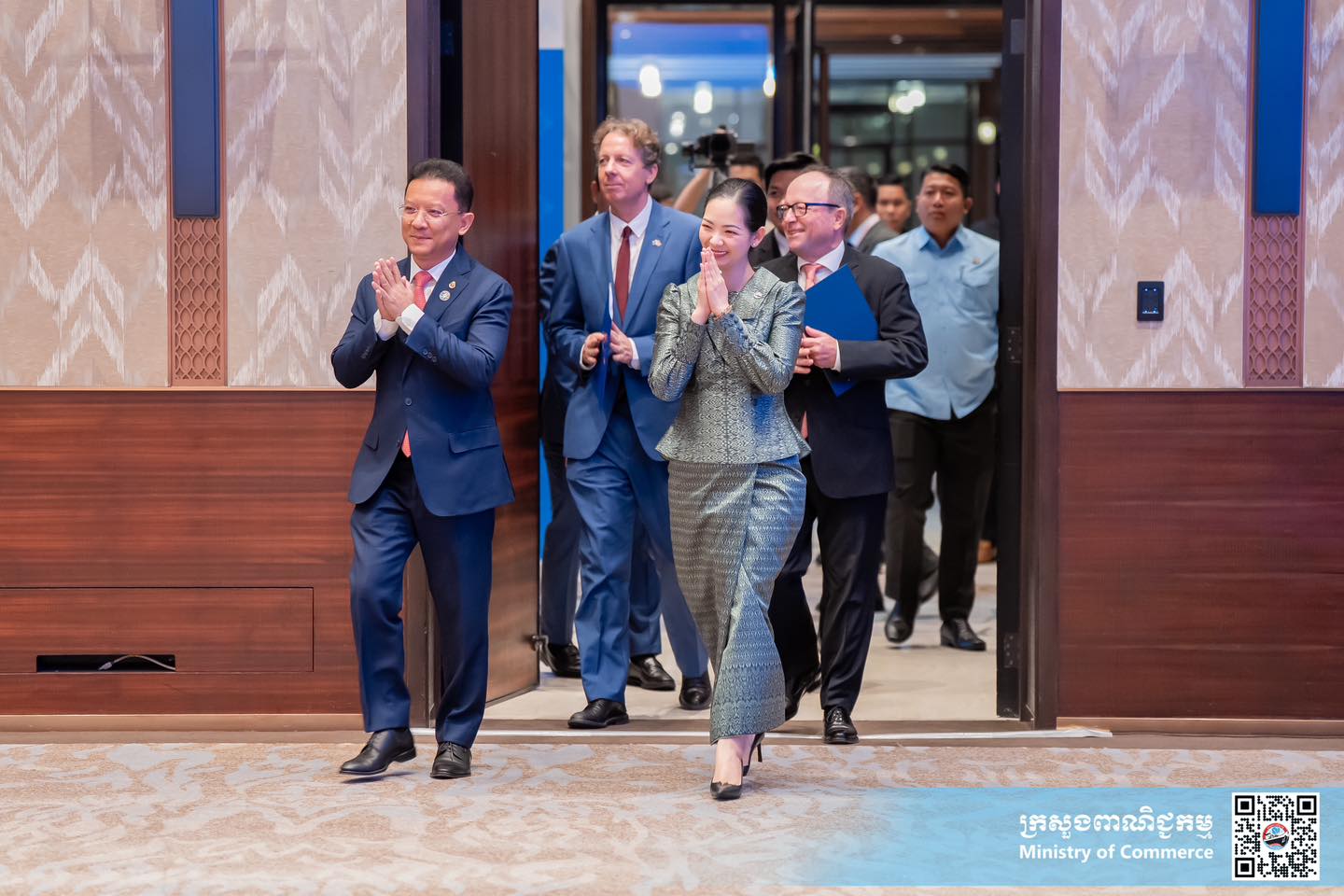 ជាកិច្ចចាប់ផ្តើម លោកជំទាវរដ្ឋមន្ត្រី ស្វាគមន៍វត្តមានចូលរួមរបស់ភាគីពាក់ព័ន្ធ និងបានថ្លែងអំណរគុណ ចំពោះតំណាងសហភាពអឺរ៉ុបប្រចាំព្រះរាជាណាចក្រកម្ពុជា សហព័ន្ធអាល្លឺម៉ង់ប្រចាំព្រះរាជាណាចក្រកម្ពុជា ដែលបានផ្តល់ការគាំទ្រតាមរយៈទីភ្នាក់ងារសហប្រតិបត្តិការអាល្លឺម៉ង់ប្រចាំនៅកម្ពុជា (GIZ Cambodia) ព្រមទាំងក្រសួង ស្ថាប័ន ដៃគូអភិវឌ្ឍន៍ វិស័យឯកជន និងភាគីពាក់ព័ន្ធ ដែលបានផ្តល់កិច្ចសហការយ៉ាងជិតស្និទ្ធជាមួយក្រសួងពាណិជ្ជកម្ម ក្នុងការរៀបចំវេទិកាដ៏មានសារៈសំខាន់នេះឡើងបានយ៉ាងល្អ និងប្រកបដោយការគិតគូរល្អិតល្អន់។