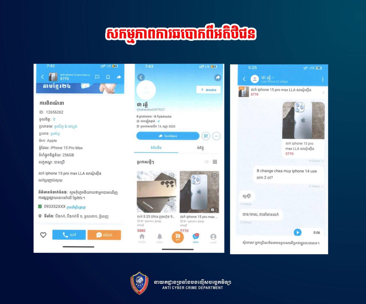 (រាជធានីភ្នំពេញ)៖ តាមការចេញផ្សាយពី នាយកដ្ឋានប្រឆាំងបទល្មើសបច្ចេកវិទ្យា នៅថ្ងៃទី ២៣ ខែតុលា ឆ្នាំ ២០២៥ នេះ បានឱ្យដឹងថា នាយកដ្ឋានប្រឆាំងបទល្មើសបច្ចេកវិទ្យា បង្រ្កាបករណីឆបោកប្រាក់ ក្រោមរូបភាពទិញ និងលក់ទូរស័ព្ទតាមប្រព័ន្ធអនឡាញ។