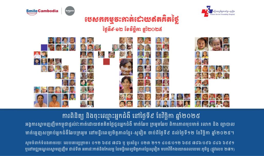 ភ្នំពេញ – អង្គការស្នាមញញឹមកម្ពុជា សហការជាមួយនឹងមន្ទីរពេទ្យមិត្តភាពខ្មែរ-សូវៀត នឹងរៀបចំ បេសកកម្មវះកាត់ ដោយឥតគិតថ្លៃ សម្រាប់កុមារ និងមនុស្សពេញវ័យ ដែលមានបញ្ហា អ្នកជំងឺមាត់ឆែប ក្រអូមឆែប រលាក និង ពិការភាពមុខមាត់ផ្សេងៗ។ ការវះកាត់នឹងប្រព្រឹត្តទៅនៅ មន្ទីរពេទ្យមិត្តភាពខ្មែរ-សូវៀត ចាប់ពីថ្ងៃទី ៩ ដល់ ១២ ខែវិច្ឆិកា ឆ្នាំ២០២៥។ ការពិនិត្យអ្នកជំងឺ នឹងធ្វើឡើងនៅថ្ងៃទី៩ ខែ វិច្ឆិកា ឆ្នាំ២០២៥។