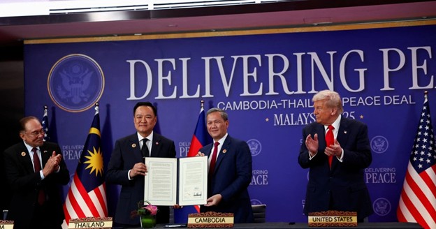 នៅក្នុងកិច្ចព្រមព្រៀងសន្តិភាពដែលត្រូវបានចុះហត្ថលេខាពីសំណាក់នាយករដ្ឋមន្ត្រីនៃប្រទេសថៃ និងនាយករដ្ឋមន្ត្រី នៃប្រទេសកម្ពុជានោះ ក៏មានការចូលរួមចុះហត្ថលេខាធ្វើសាក្សីពីសំណាក់លោកប្រធានាធិបតីអាមេរិក ដូណាល់ ត្រាំ ផងដែរ។ សូមបញ្ជាក់ជូនថា គិតត្រឹមពេលនេះគឺវាមានរយៈពេល ៣ខែហើយ ដែលភាគីថៃបានចាប់ខ្លួនទាហានកម្ពុជាទាំង ១៨រូបនោះ ខណៈភាគីថៃបានអះអាងថា ទាហានទាំង ១៨រូបនោះមានសុខភាពល្អជាធម្មតា៕