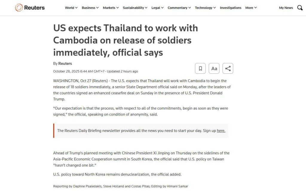 អាមេរិក៖ មន្ត្រីជាន់ខ្ពស់អាមេរិករំពឹងថា ប្រទេសថៃនឹងធ្វើជាមួយកម្ពុជាដើម្បីដោះលែងទាហានកម្ពុជាទាំង ១៨រូបជាបន្ទាន់ នេះបើយោងតាមការចុះផ្សាយរបស់បណ្តាញសារព័ត៌មាន Reuter នៅក្នុងថ្ងៃទី២៨ ខែតុលា។ ការលើកឡើងខាងលើនេះត្រូវបានធ្វើឡើង ក្រោយប្រទេសថៃនិងកម្ពុជាបានចុះហត្ថលេខាលើកិច្ចព្រមព្រៀងសន្តិភាពនៅក្នុងប្រទេសម៉ាឡេស៊ីរួចរាល់ហើយកាលពីថ្ងៃអាទិត្យកន្លងទៅនេះ។
