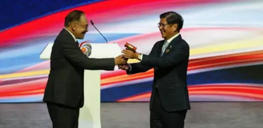 គូឡាឡាំពួរ៖ លោក អាន់វ៉ា អ៊ីប្រាហ៊ីម នាយករដ្ឋមន្ត្រីម៉ាឡេសុី និងជាប្រធានអាស៊ាន ឆ្នាំ២០២៥ បានប្រគល់ញញួរប្រធានអាស៊ានប្តូរវេន ដល់ប្រធានាធិបតីហ្វីលីពីន លោក Ferdinand Marcos Jr នៅថ្ងៃនេះ ក្នុងការប្រគល់ជានិមិត្តរូប ដែលបង្ហាញពីការចូលកាន់តំណែងជាប្រធានអាស៊ានរបស់ប្រទេសហ្វីលីពីននៅឆ្នាំក្រោយ។