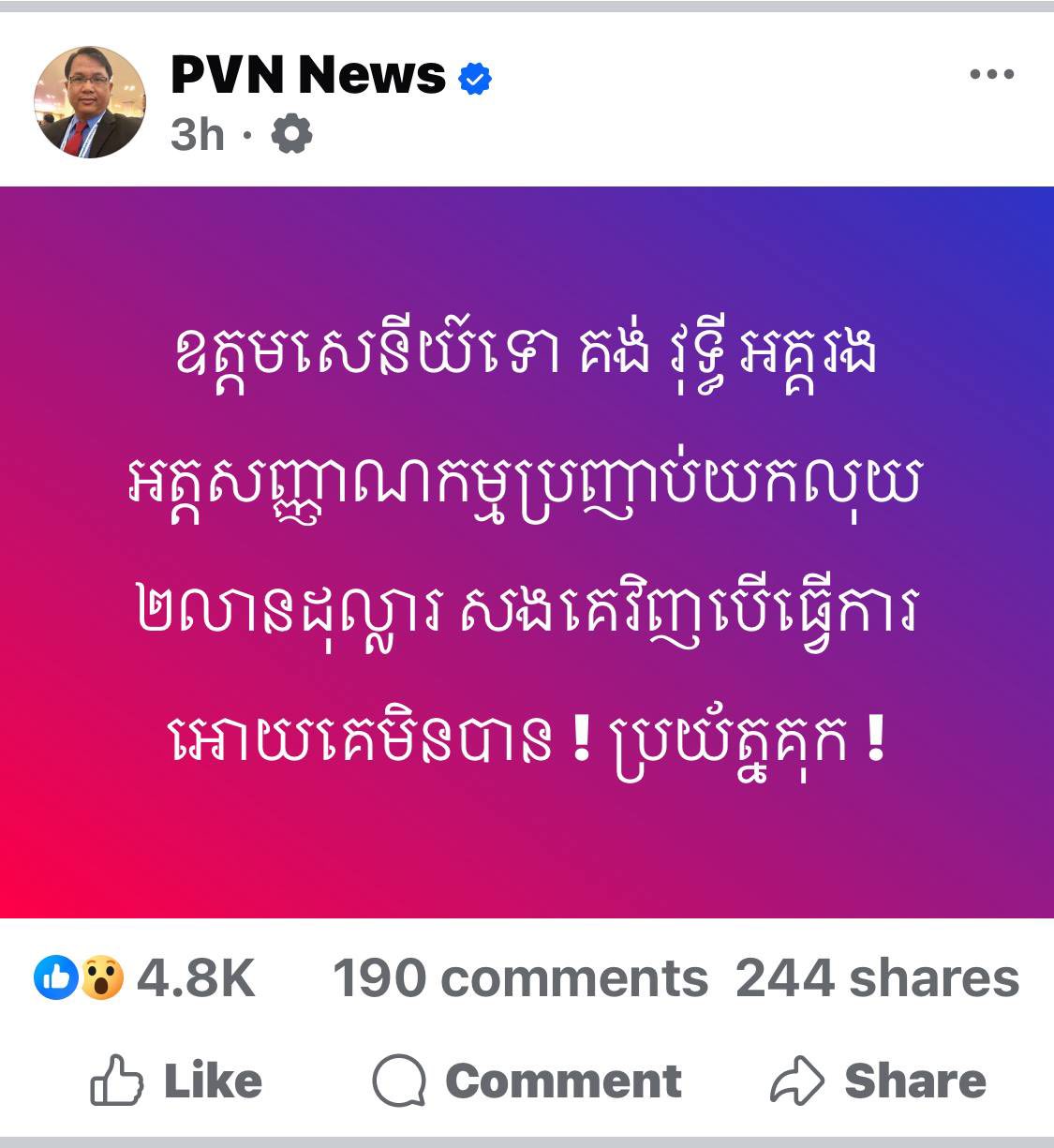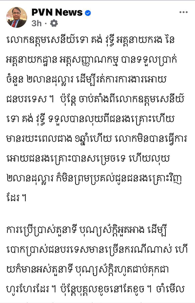 (រាជធានីភ្នំពេញ)៖ នៅរសៀលថ្ងៃទី ២៨ ខែតុលា ឆ្នាំ ២០២៥ នេះ ក្រោយមានការបង្ហោះ ពាក់ព័ន្ធករណី ឯកឧត្តម ឧត្តមសេនីយ៍ទោ គង់ វុទ្ធី ទទួលប្រាក់រត់ការចូលសញ្ចាតិឱ្យជនបរទេសមិនបានសម្រេច ហើយមិនព្រមប្រគល់ប្រាក់ជូនជនរងគ្រោះវិញ អគ្គនាយកដ្ឋានអត្តសញ្ញាណកម្ម បានចាត់វិធានការកោះហៅ ឯកឧត្តម ឧត្តមសេនីយ៍ទោ គង់ វុទ្ធី ដើម្បីមកបំភ្លឺ និងកំពុងបន្តស្រាវជ្រាវ ស៊ើបបញ្ជាក់បន្ថែមលើព័ត៌មានមយយនេះ។