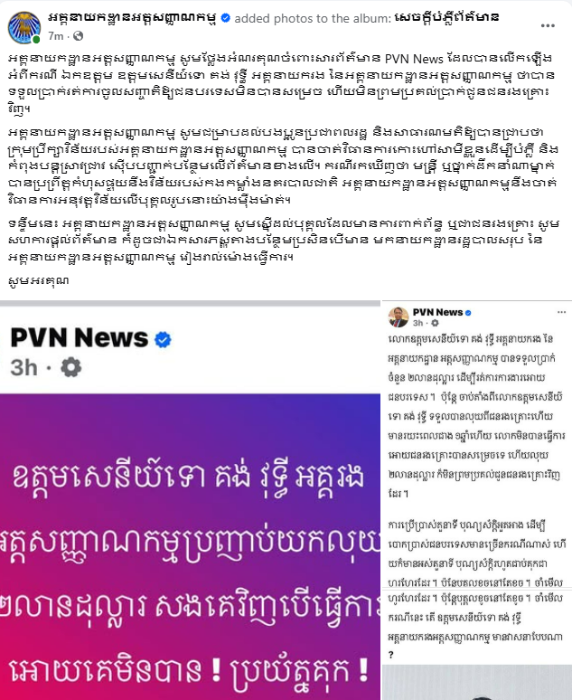ក្នុងនោះដែរ អគ្គនាយកដ្ឋានអត្តសញ្ញាណកម្ម បានបញ្ជាក់ថា សូមថ្លែងអំណរគុណចំពោះសារព័ត៌មាន PVN News ដែលបានលើកឡើងអំពីករណី ឯកឧត្តម ឧត្តមសេនីយ៍ទោ គង់ វុទ្ធី អគ្គនាយករង នៃអគ្គនាយកដ្ឋានអត្តសញ្ញាណកម្ម ថាបានទទួលប្រាក់រត់ការចូលសញ្ចាតិឱ្យជនបរទេសមិនបានសម្រេច ហើយមិនព្រមប្រគល់ប្រាក់ជូនជនរងគ្រោះវិញ។