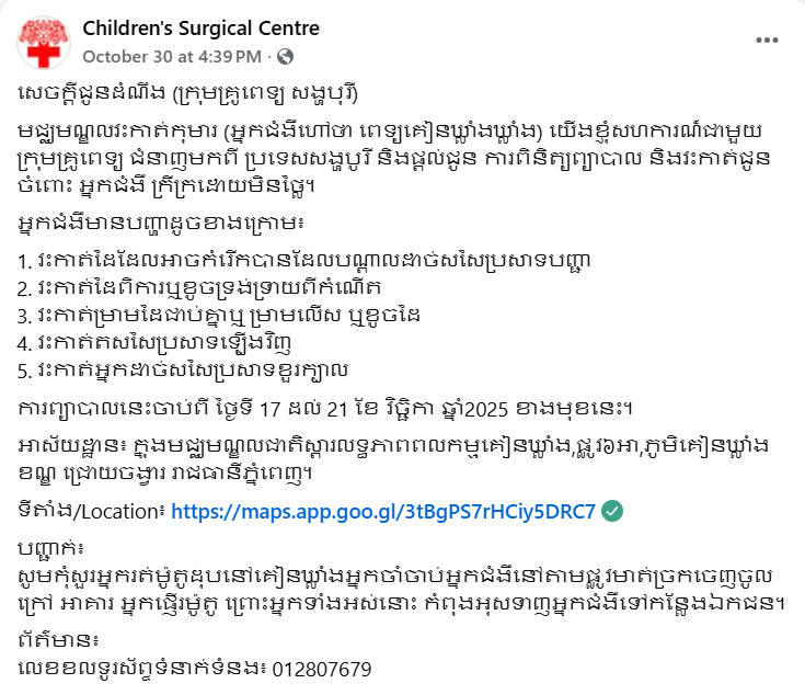 ដោយឡែកចំពោះការព្យាបាលនេះចាប់ពីគឺ ចាប់ពីថ្ងៃទី ១៧ ដល់ ២១ ខែ វិច្ជិកា ឆ្នាំ ២០២៥។ រីឯទីតាំងរបស់ មជ្ឈមណ្ឌលវះកាត់កុមារ ឬហៅថា ពេទ្យគៀនឃ្លាំងឃ្លាំង ស្ថិតនៅក្នុងមជ្ឈមណ្ឌលជាតិស្តារលទ្ធភាពពលកម្មគៀនឃ្លំាង ផ្លូវ៦អា ភូមិគៀនឃ្លំាង ខណ្ឌ ជ្រោយចង្វារ រាជធានីភ្នំពេញ ឬអាចស្គេនទីតាំង/Location៖ https://maps.app.goo.gl/3tBgPS7rHCiy5DRC7 ។