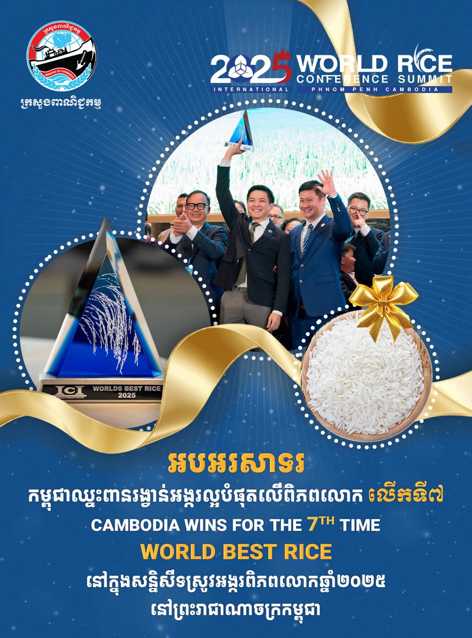 កម្ពុជាឈ្នះពានរង្វាន់អង្ករល្អបំផុតលើពិភពលោកលើកទី ៧ នៅក្នុងសន្និសីទស្រូវអង្ករពិភពលោក ឆ្នាំ២០២៥