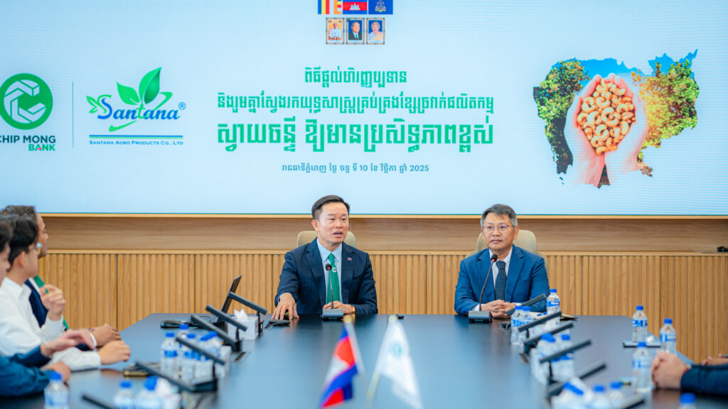 រាជធានីភ្នំពេញ ថ្ងៃទី 10 ខែវិច្ឆិកា ឆ្នាំ 2025 – ធនាគារ ជីប ម៉ុង បានរៀបចំ “ពិធីផ្តល់ហិរញ្ញប្បទាន និងរួមគ្នាស្វែងរកយុទ្ធសាស្រ្តគ្រប់គ្រងខ្សែច្រវាក់ផលិតកម្មស្វាយចន្ទីឱ្យមានប្រសិទ្ធភាពខ្ពស់” នៅទីស្នាក់ការកណ្តាល ក្នុងអគារ ជីប ម៉ុង ថៅវើរ ដែលជាកិច្ចសហការជាយុទ្ធសាស្ត្រជាមួយក្រុមហ៊ុន សានតាណា អាហ្គ្រោ ប្រូដាក់ ឯ.ក ដើម្បីជំរុញវិស័យគ្រាប់ស្វាយចន្ទី និងបង្កើនផលិតកម្ម និងកែច្នៃនៅកម្ពុជា។