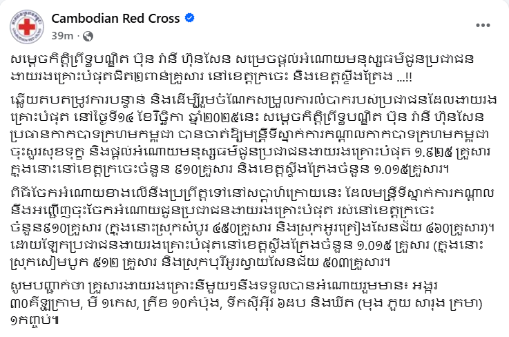 តាមការចុះផ្សាយពី កាកបាទក្រហមកម្ពុជា នៅថ្ងៃព្រឹកថ្ងៃទី ១៤ ខែវិច្ឆិកា ឆ្នាំ ២០២៥ នេះ បាឱ្យដឹងថា សម្តេចកិត្តិព្រឹទ្ធបណ្ឌិត ប៊ុន រ៉ានី ហ៊ុនសែន សម្រេចផ្តល់អំណោយមនុស្សធម៌ជូនប្រជាជនងាយរងគ្រោះបំផុតជិត ២ពាន់គ្រួសារ នៅខេត្តក្រចេះ និងខេត្តស្ទឹងត្រែង ដើម្បីរួមចំណែកសម្រួលការលំបាករបស់ប្រជាជនដែលងាយរងគ្រោះបំផុត។