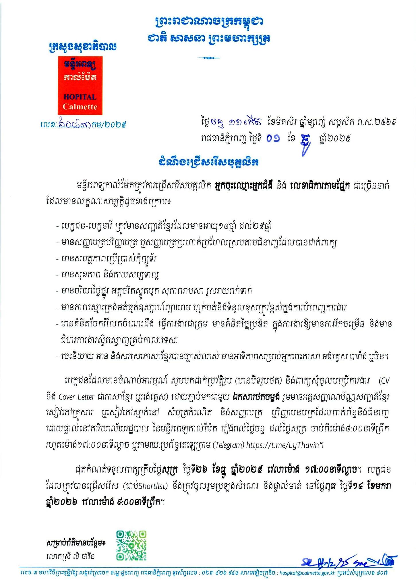 (រាជធានីភ្នំពេញ)៖ មន្ទីរពេទ្យកាល់ម៉ែត បានឱ្យដឹងថា កំពុងត្រូវការជ្រើសរើសបុគ្គលិក មានដូចជា អ្នកចុះឈ្មោះអ្នកជំងឺ និង លេខាធិការតាមផ្នែក ជាច្រើននាក់ ពីថ្ងៃជូនដំណឹង ដល់ថ្ងៃទី ២៦ ខែធ្នូ ឆ្នាំ ២០២៥ ខាងមុខនេះ។