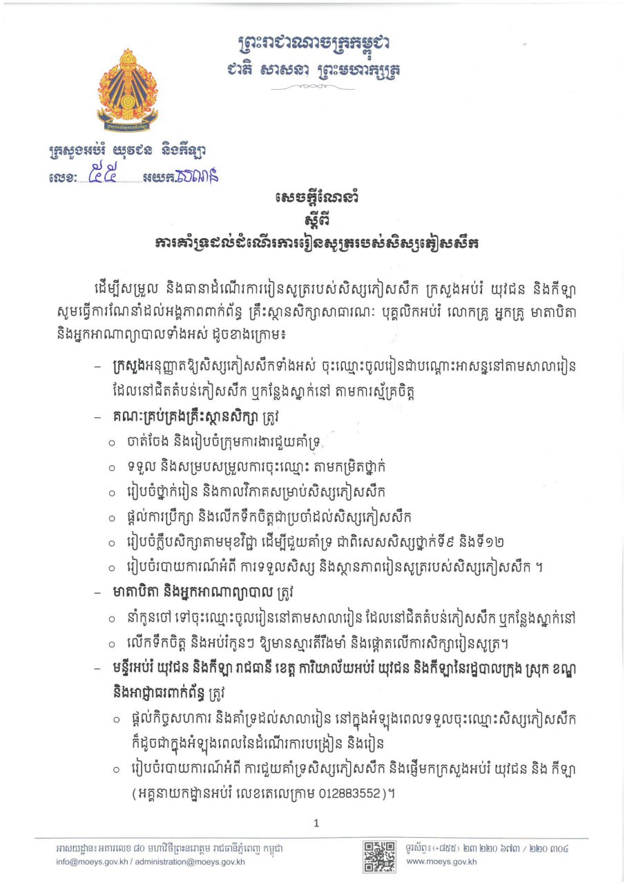 ក្នុងនោះ ក្រសួងអប់រំ យុវជន និងកីឡា បានបន្ថែមថា ដើម្បីសម្រួល និងធានាដំណើរការរៀនសូត្ររបស់សិស្សភៀសសឹក ក្រសួងអប់រំ យុវជន និងកីឡា សូមធ្វើការណែនាំដល់អង្គភាពពាក់ព័ន្ធ គ្រឹះស្ថានសិក្សាសាធារណៈ បុគ្គលិកអប់រំ លោកគ្រូ អ្នកគ្រូ មាតាបិតា និងអ្នកអាណាព្យាបាលទាំងអស់ ដូចខាងក្រោម៖