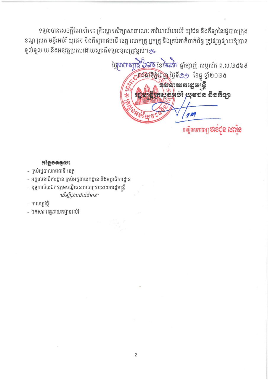 យោងតាមក្រសួងអប់រំ យុវជន និងកីឡា នៅថ្ងៃទី ១១ ខែធ្នូ ឆ្នាំ ២០២៥ នេះ បានឱ្យដឹងថា ក្រសួងអប់រំបានអនុញ្ញាតឱ្យសិស្សភៀសសឹកទាំងអស់ចុះឈ្មោះចូលរៀនបណ្តោះអាសន្ននៅតាមសាលារៀននៅជិតតំបន់ភៀសសឹក ឬកន្លែងស្នាក់នៅតាមការស្ម័គ្រចិត្ត។