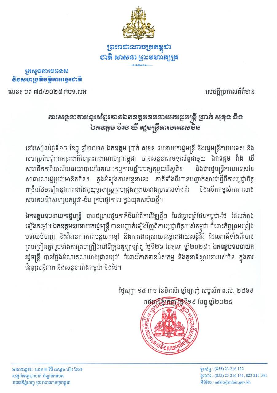 ឯកឧត្តមឧបនាយករដ្ឋមន្ត្រី ប្រាក់ សុខុន និង ឯកឧត្តម វ៉ាង យី រដ្ឋមន្ត្រីការបរទេសចិន បានសន្ទនាគ្នាតាមទូរស័ព្ទ និងបានបញ្ជាក់ពីការវិវឌ្ឍថ្មីៗនៃជម្លោះព្រំដែនកម្ពុជា-ថៃ