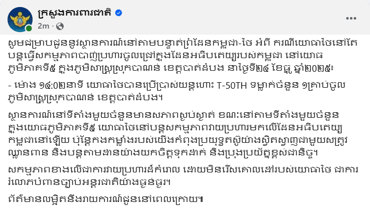 ចំពោះស្ថានការណ៍នៅតាមបន្ទាត់ព្រំដែនកម្ពុជា-ថៃ អំពី ករណីយោធាថៃនៅតែបន្តធ្វើសកម្មភាពបាញ់ប្រហារចូលជ្រៅក្នុងដែនអធិបតេយ្យរបស់កម្ពុជា នៅយោធភូមិភាគទី៥ ក្នុងភូមិសាស្ត្រស្រុកបាណន់ ខេត្តបាត់ដំបង នាថ្ងៃទី២៤ ខែធ្នូ ឆ្នាំ២០២៥៖