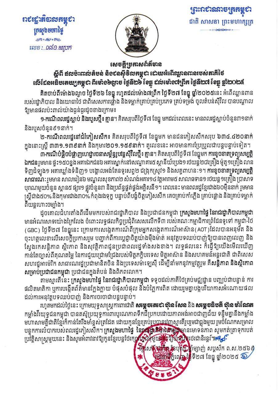 ក្នុងសេចក្ដីប្រកាសព័ត៌មានរបស់ ក្រសួងមហាផ្ទៃ បានបន្ថែមថា គិតចាប់ពីម៉ោង ៦ល្ងាច ថ្ងៃទី២៦ ខែធ្នូ រហូតដល់ម៉ោង ៧ព្រឹក ថ្ងៃទី ២៧ ខែធ្នូ ឆ្នាំ ២០២៥ នេះ អំពើឈ្លានពាន របស់រដ្ឋាភិបាល និងយោធាថៃ ជាពិសេសការផ្លោង និងទម្លាក់គ្រាប់គ្រប់ប្រភេទ គ្រប់ទម្រង់ ចូលតំបន់ស៊ីវិល បានបណ្តាល ឱ្យមានផលប៉ះពាល់យ៉ាងធ្ងន់ធ្ងរដូចខាងក្រោម៖