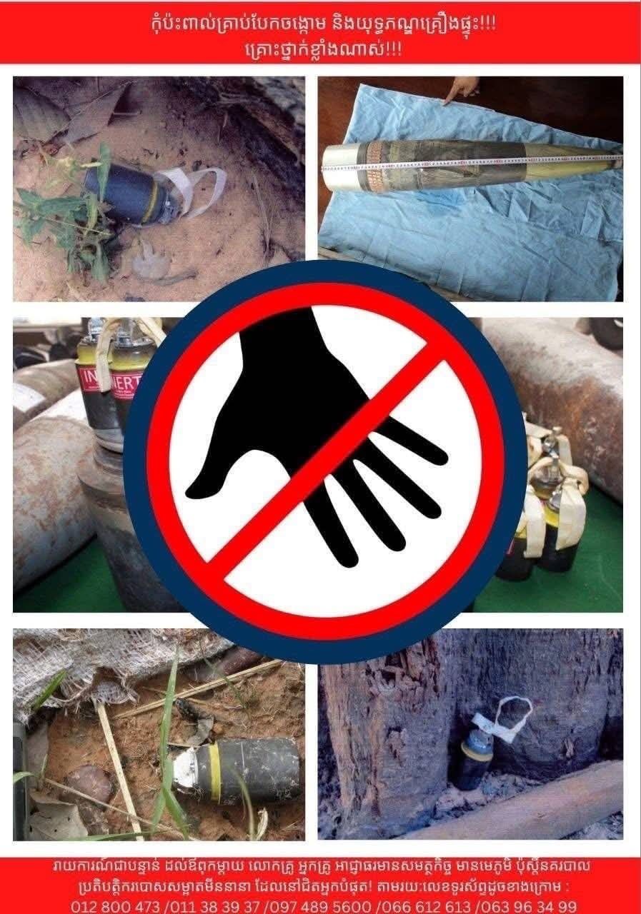 ជាមួយគ្នានេះ អាជ្ញាធរមីនសូមអំពាវនាវ សូមកុំចូលតំបន់ណាដែលសង្ស័យបន្សល់គ្រាប់យុទ្ធភណ្ឌមិនទាន់ផ្ទុះសេសសល់ពីសង្គ្រាម និងមុនចូលតំបន់នោះត្រូវសាកសួរព័ត៍មានពីអាជ្ញាធរមានសមត្ថកិច្ច មេភូមិ មេឃុំ និងប៉ុស្តិ៍នគរបាល។