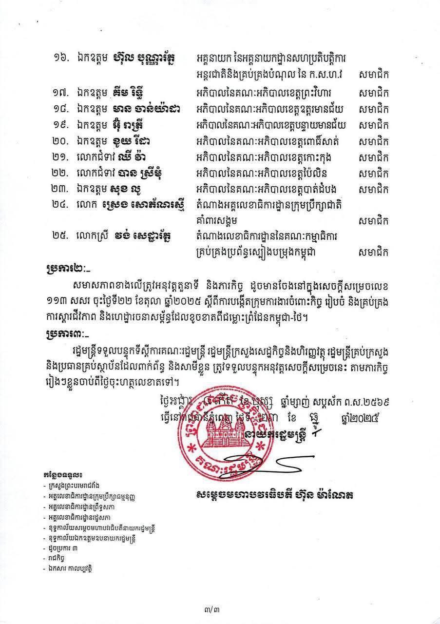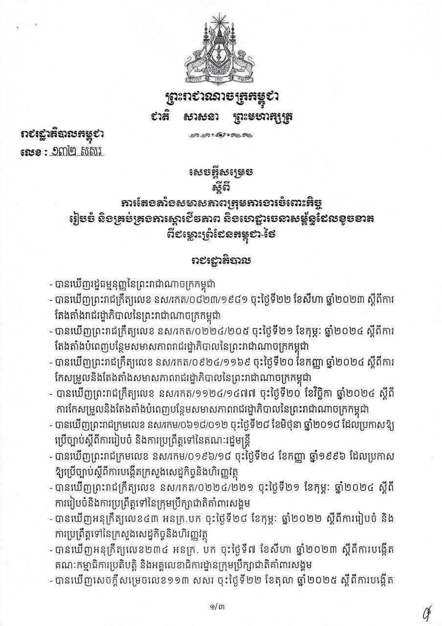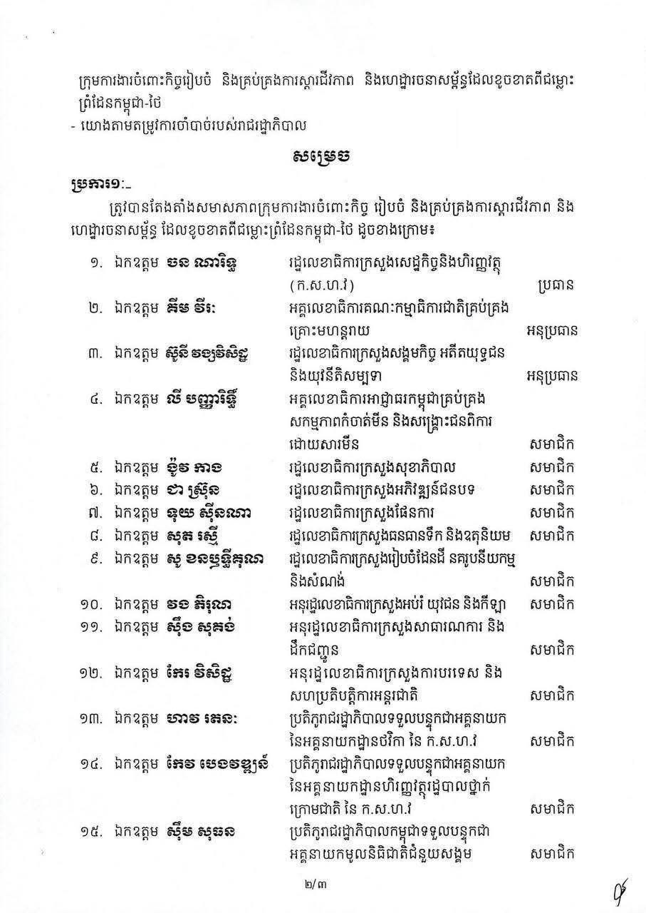 យោងតាមសេចក្ដីសមរេ្របស់ រាជរដ្ឋាភិបាលកម្ពុជា ក្រុមការងារចំពោះកិច្ចរៀបចំ និងគ្រប់គ្រងការស្តារជីវភាព និងហេដ្ឋារចនាសម្ព័ន្ធដែលខូចខាតពីជម្លោះ ព្រំដែនកម្ពុជា-ថៃ ត្រូវបានតែងតាំងសមាសភាពក្រុមការងារចំពោះកិច្ច រៀបចំ និងគ្រប់គ្រងការស្តារជីវភាព និង ហេដ្ឋារចនាសម្ព័ន្ធ ដែលខូចខាតពីជម្លោះព្រំដែនកម្ពុជា-ថៃ៕