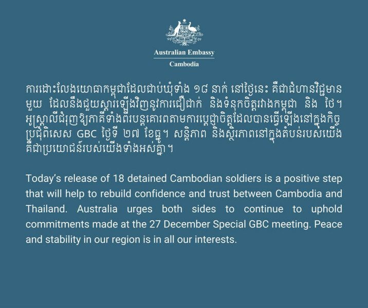 ស្ថានទូតអូស្ដាលីប្រចាំនៅកម្ពុជា បានបញ្ជាក់តាមបណ្តាញទំនាក់ទំនងសង្គមផ្លូវការ នាព្រឹកថ្ងៃទី ៣១ ខែធ្នូ ឆ្នាំ ២០២៥ នេះ ថា ការដោះលែងយោធាកម្ពុជាដែលជាប់ឃុំទាំង ១៨នាក់ នៅថ្ងៃនេះ គឺជាជំហានវិជ្ជមានមួយ ដែលនឹងជួយស្ដារឡើងវិញនូវការជឿជាក់ និងទំនុកចិត្តរវាងកម្ពុជា និងថៃ។