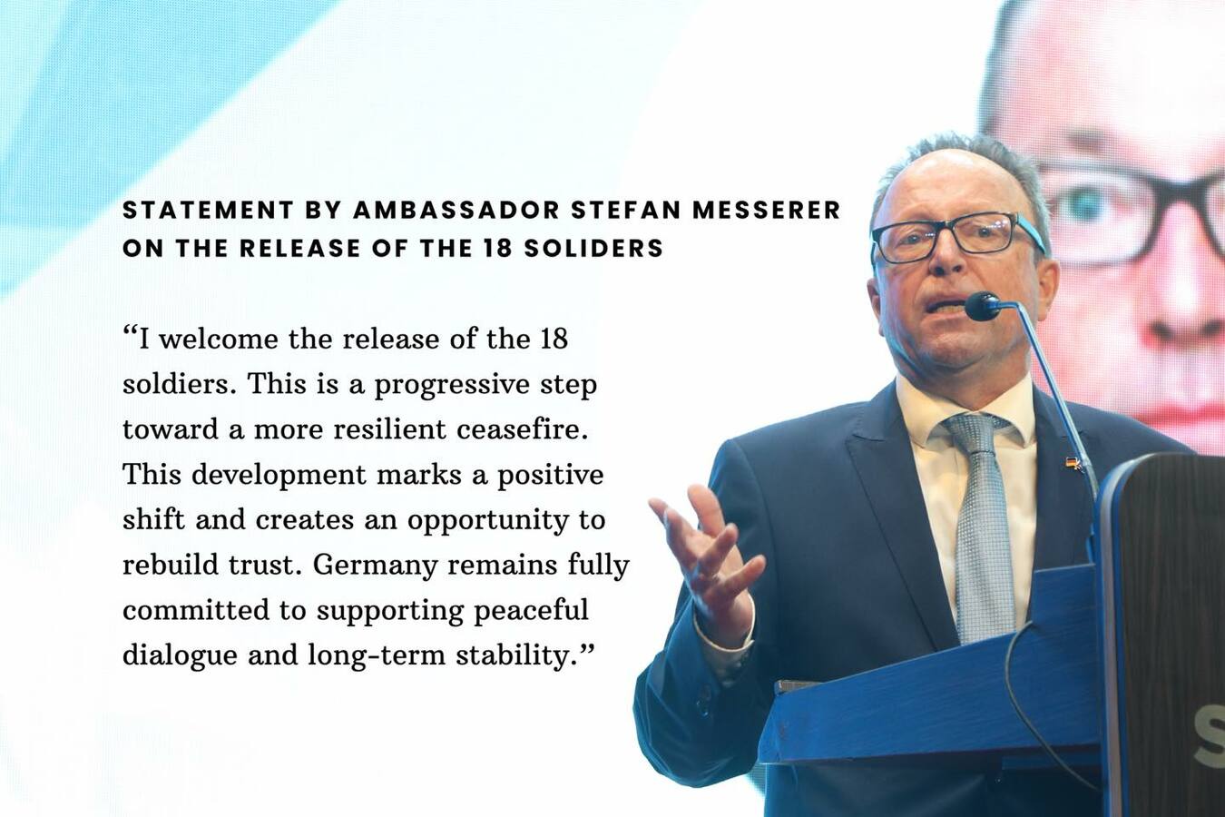 យោងតាមការចុះផ្សាយរបស់ ក្រសួងព័ត៌មាន នៅរសៀលថ្ងៃទី ៣១ ខែធ្នូ ឆ្នាំ ២០២៥ នេះ បានឱ្យដឹងថា ឯកឧត្តម Stefan Messerer ឯកអគ្គរដ្ឋទូតអាល្លឺម៉ងប្រចាំកម្ពុជា បានសម្តែងនូវការស្វាគមន៍ចំពោះការដោះលែងទាហាន ១៨ រូប ដែលនេះគឺជាជំហានមួយឆ្ពោះទៅរកបទឈប់បាញ់ ឱ្យកាន់តែរឹងមាំ។
