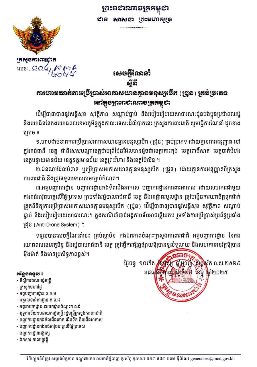 ក្រសួងការពារជាតិ បានចេញសេចក្តីណែនាំ ស្តីពីការហាមឃាត់ដាច់ខាតលើការប្រើប្រាស់អាកាសយានគ្មានមនុស្សបើក (ដ្រូន) គ្រប់ប្រភេទនៅទូទាំងប្រទេស ជាពិសេសតាមបណ្តាខេត្តជាប់ព្រំដែន