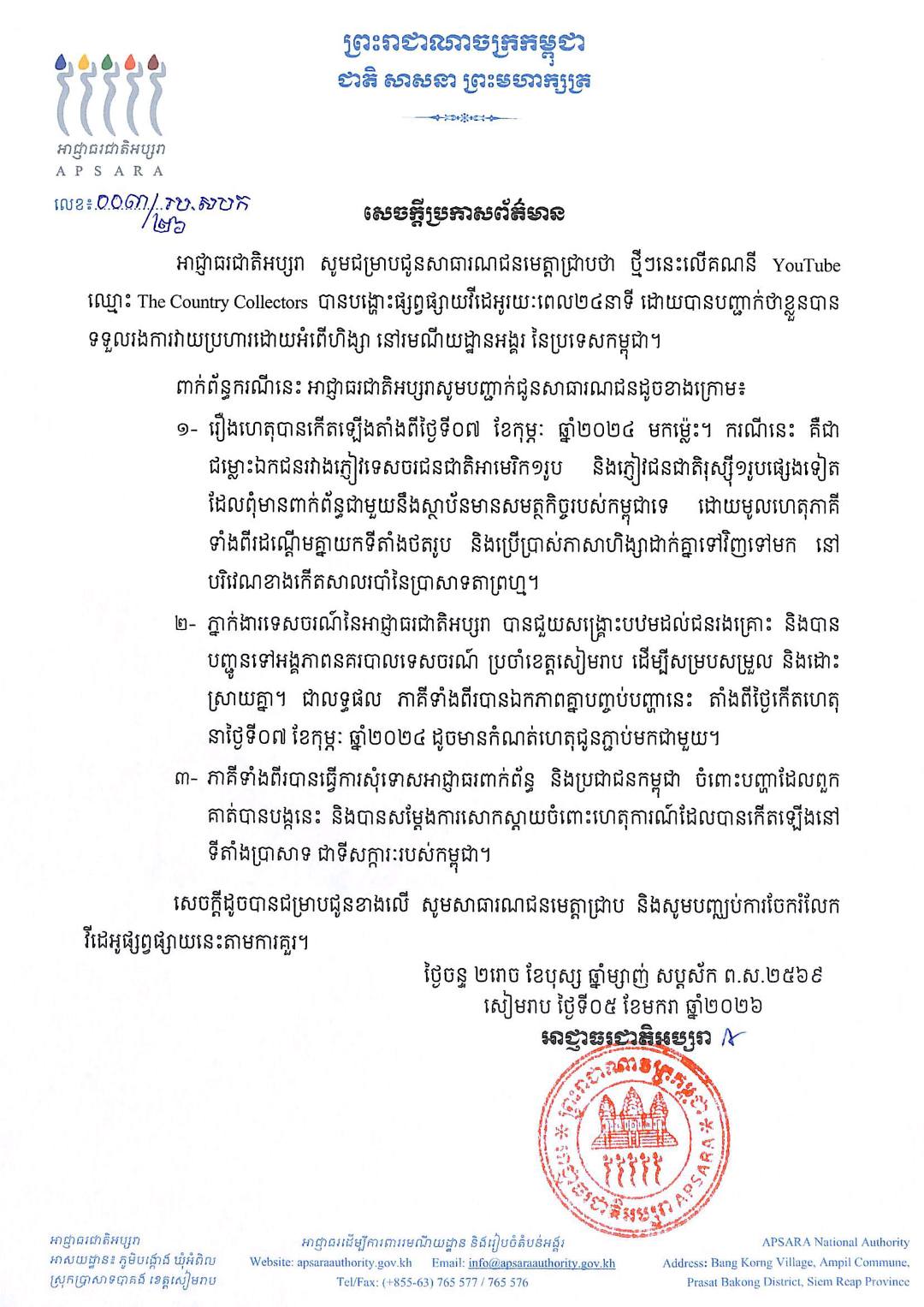 នាថ្ងៃទី ៦ ខែមករា ឆ្នាំ ២០២៦ នេះ អាជ្ញាធរជាតិអប្សរា ចេញសេចក្តីបំភ្លឺ ៣ចំណុច ពាក់ព័ន្ធនឹងថ្មីៗនេះនៅលើគណនី YouTube ឈ្មោះ The Country Collectors បានបង្ហោះផ្សព្វផ្សាយវីដេអូរយៈពេល២៤នាទី ដោយបានបញ្ជាក់ថាខ្លួនបានទទួលរងការវាយប្រហារដោយអំពើហិង្សា នៅរមណីយដ្ឋានអង្គរ នៃប្រទេសកម្ពុជា។