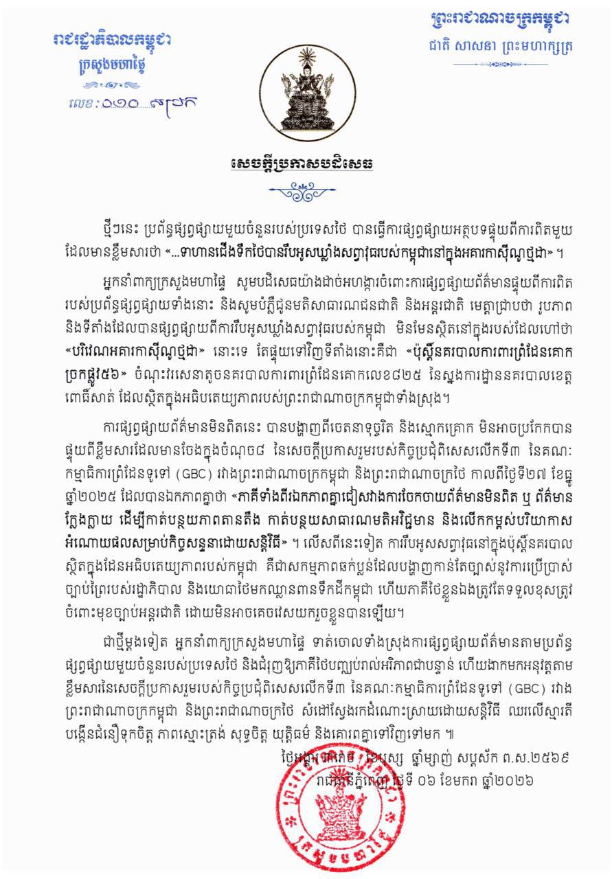 តាមការចុះផ្សាយពី ឯកសារមន្ត្រីសាធារណៈ នៅថ្ងៃទី ៦ ខែមករា ឆ្នាំ ២០២៦ ក្រសួងមហាផ្ទៃ បានបានចេញសេចក្ដីប្រកាសបដិសេធ ពីការផ្សាយរបស់សារព័ត៌មានថៃមួយ ដែលថា “ទាហានជើងទឹកថៃរឹបអូសឃ្លាំងសព្វាវុធកម្ពុជាក្នុងអគារកាស៊ីណូថ្មដា” ខណៈការពិត គឺជា “ប៉ុស្តិ៍នគរបាលការពារព្រំដែនគោក” ក្នុងដែនអធិបតេយ្យកម្ពុជា។