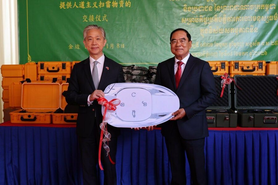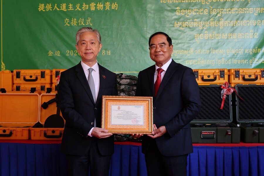 ថ្ងៃទី០៨ ខែមករា ឆ្នាំ២០២៦ នៅទីស្នាក់ការអាជ្ញាធរមីន ឯកឧត្តមបណ្ឌិត លី ធុជ ទេសរដ្ឋមន្រ្តី អនុប្រធានទី១ អាជ្ញាធរមីន និង ឯកឧត្តម វ៉ាង វិនពីន ឯកអគ្គរដ្ឋទូតនៃសាធារណរដ្ឋប្រជាមានិតចិន ប្រចាំនៅកម្ពុជា បានអញ្ជើញជាអធិបតីក្នុងពិធីប្រគល់-ទទួលសម្ភារដែលជាជំនួយរបស់រដ្ឋាភិបាលនៃសាធារណរដ្ឋប្រជាមានិតចិន សម្រាប់កិច្ចប្រតិបត្តិការការងារមនុស្សធម៌ក្នុងវិស័យសកម្មភាពមីននៅកម្ពុជា។ សម្ភារទាំងនោះ រួមមានឧបករណ៍រាវរកលោហៈ ឧបករណ៍និងសម្ភារចាំបាច់ និងរថយន្ត។
