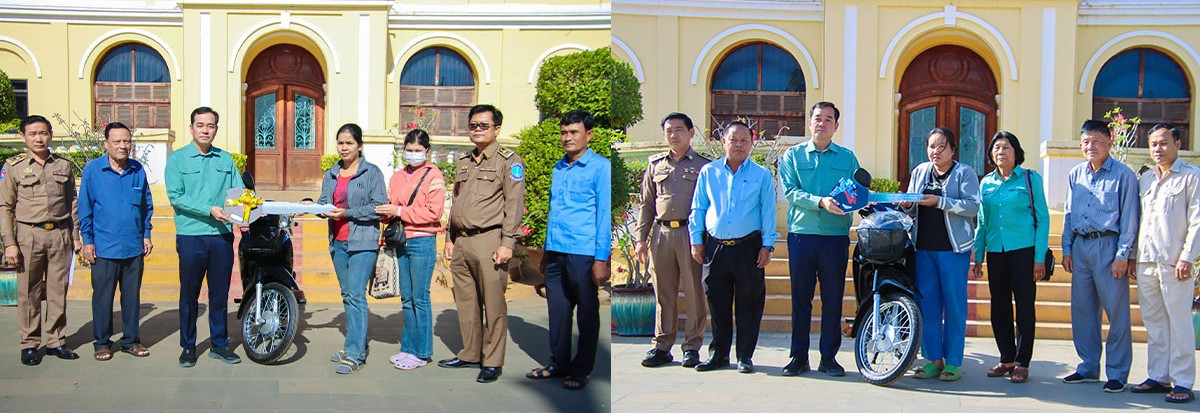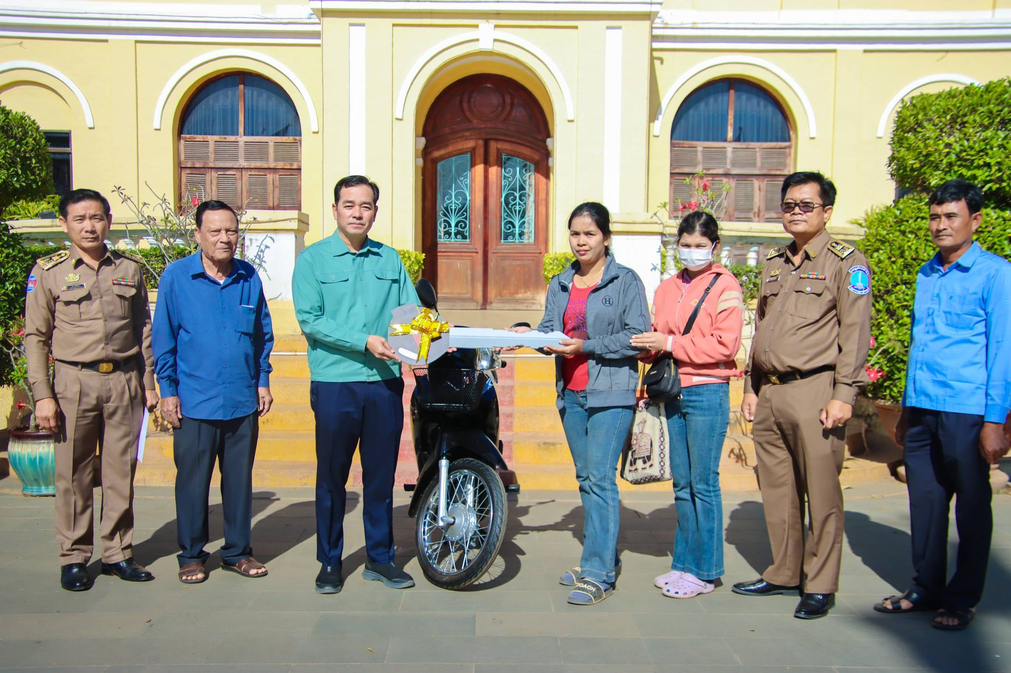 អភិបាលខេត្តកំពង់ចាម ប្រគល់ម៉ូតូ ២គ្រឿង ជាអំណោយរបស់ លោកជំទាវបណ្ឌិត ពេជ ចន្ទមុន្នី ហ៊ុន ម៉ាណែត ជូនគ្រួសារវីរកងទ័ព ២គ្រួសារ