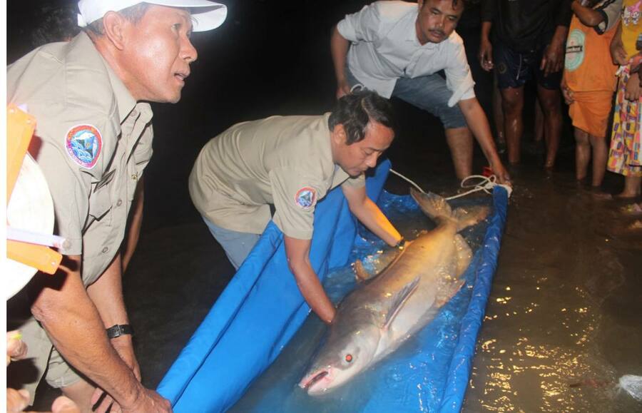 ១ក្បាលមានប្រវែង ២ម៉ែត្រ១៥និងមានទម្ងន់សរុប ៩៧គីឡូក្រាមចូលក្នុងទន្លេមេគង្គ វិញបន្ទាប់ពីបានពាក់ស្លាករដ្ឋបាលជលផល លេខកូដ៥០០។