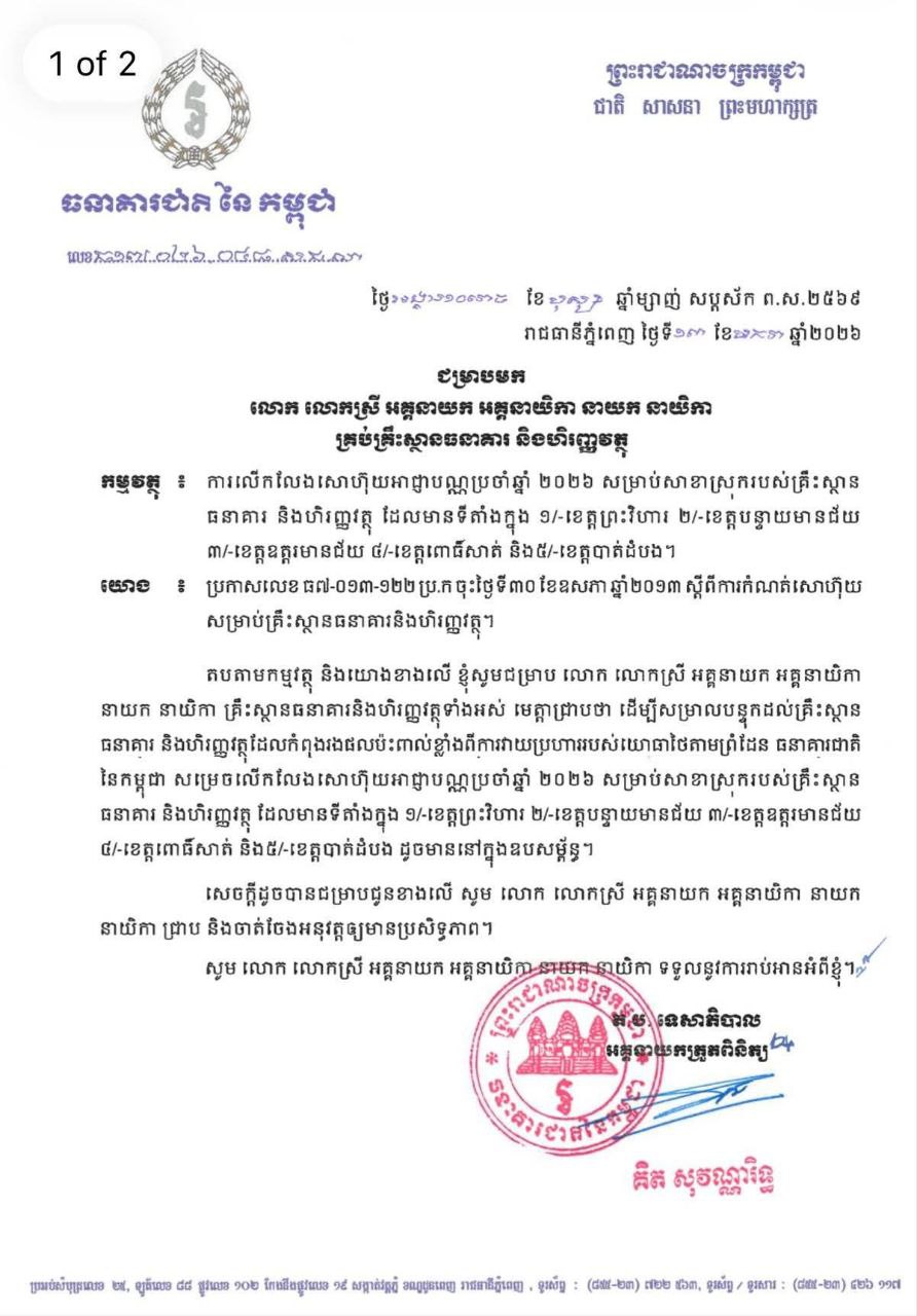 យោងតាមការបញ្ជាក់របស់ ធនាគារជាតិនៃកម្ពុជា ដោយជម្រាបជូនដល់ គ្រឹះស្ថានធនាគារនិងហិរញ្ញវត្ថុទាំងអស់ ឱ្យបានជ្រាបថា ដើម្បីសម្រាលបន្ទុកដល់គ្រឹះស្ថាន ធនាគារ និងហិរញ្ញវត្ថុដែលកំពុងរងផលប៉ះពាល់ខ្លាំងពីការវាយប្រហាររបស់យោធាថៃតាមព្រំដែន ធនាគារជាតិ នៃកម្ពុជា សម្រេចលើកលែងសោហ៊ុយអាជ្ញាបណ្ណប្រចាំឆ្នាំ ២០២៦ សម្រាប់សាខាស្រុករបស់គ្រឹះស្ថាន ធនាគារ និងហិរញ្ញវត្ថុ ដែលមានទីតាំងដូចជា៖ ១/-ខេត្តព្រះវិហារ ២/-ខេត្តបន្ទាយមានជ័យ ៣/-ខេត្តឧត្តរមានជ័យ ៤/-ខេត្តពោធិ៍សាត់ និង៥/-ខេត្តបាត់ដំបង ដូចមាននៅក្នុងឧបសម្ព័ន្ធ៕