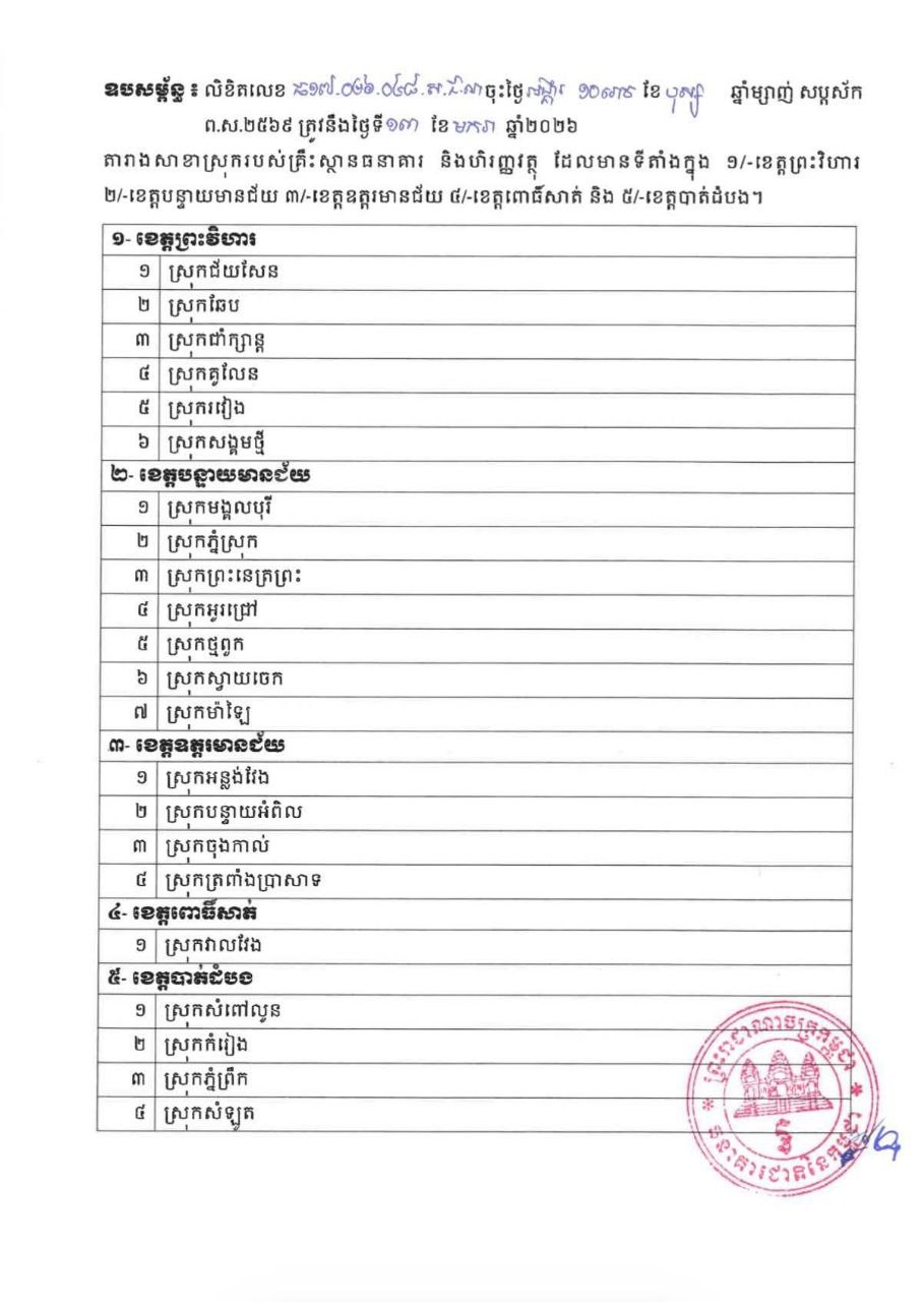ធនាគារជាតិ លើកលែងសោហ៊ុយអាជ្ញាបណ្ណប្រចាំឆ្នាំ២០២៦ សាខាស្រុកមួយចំនួននៃខេត្ត ដែលរងផលប៉ះពាល់ពីការវាយប្រហាររបស់យោធាសៀមតាមព្រំដែន ដល់គ្រឹះស្ថានធនាគារ និង ហិរញ្ញវត្ថុ