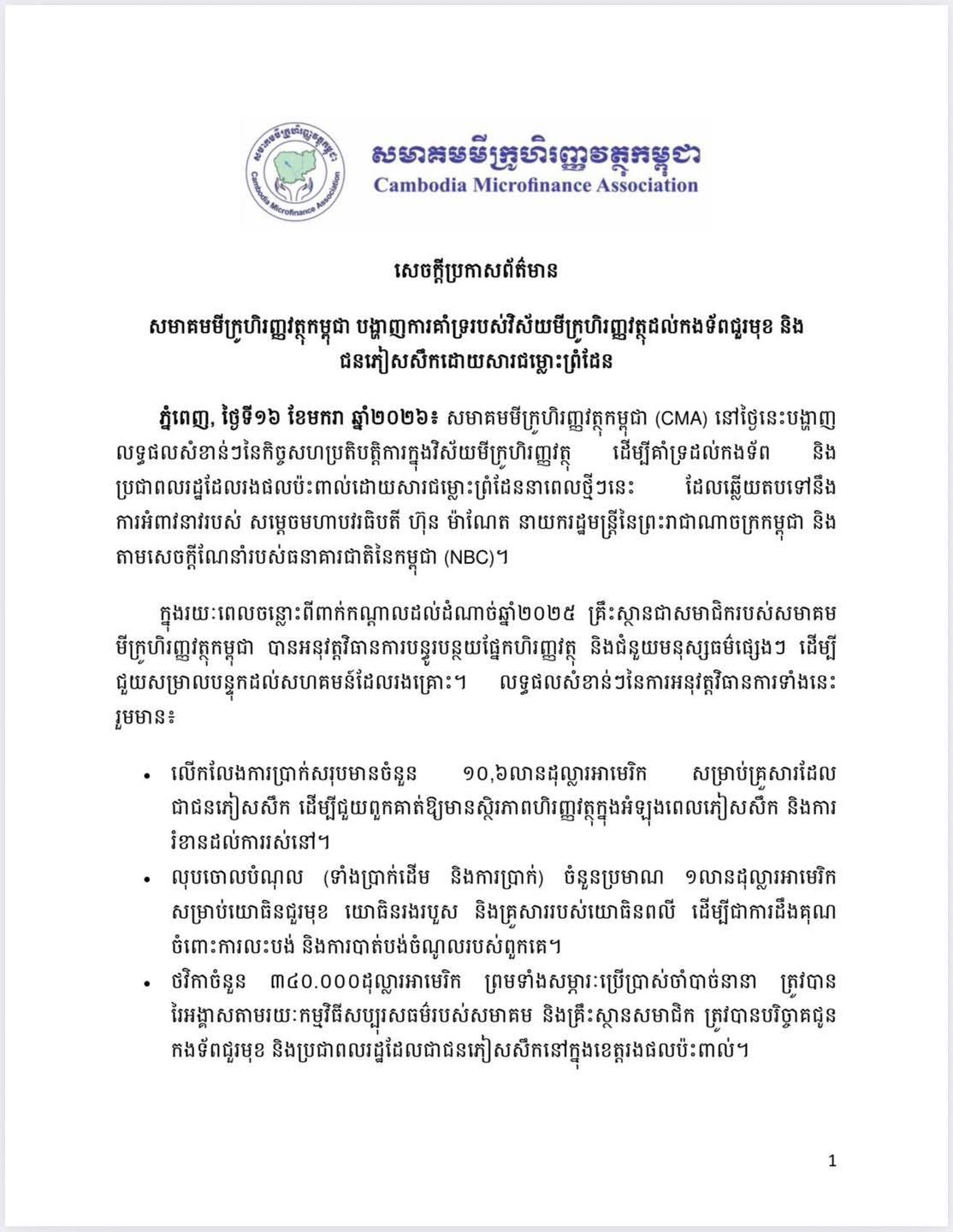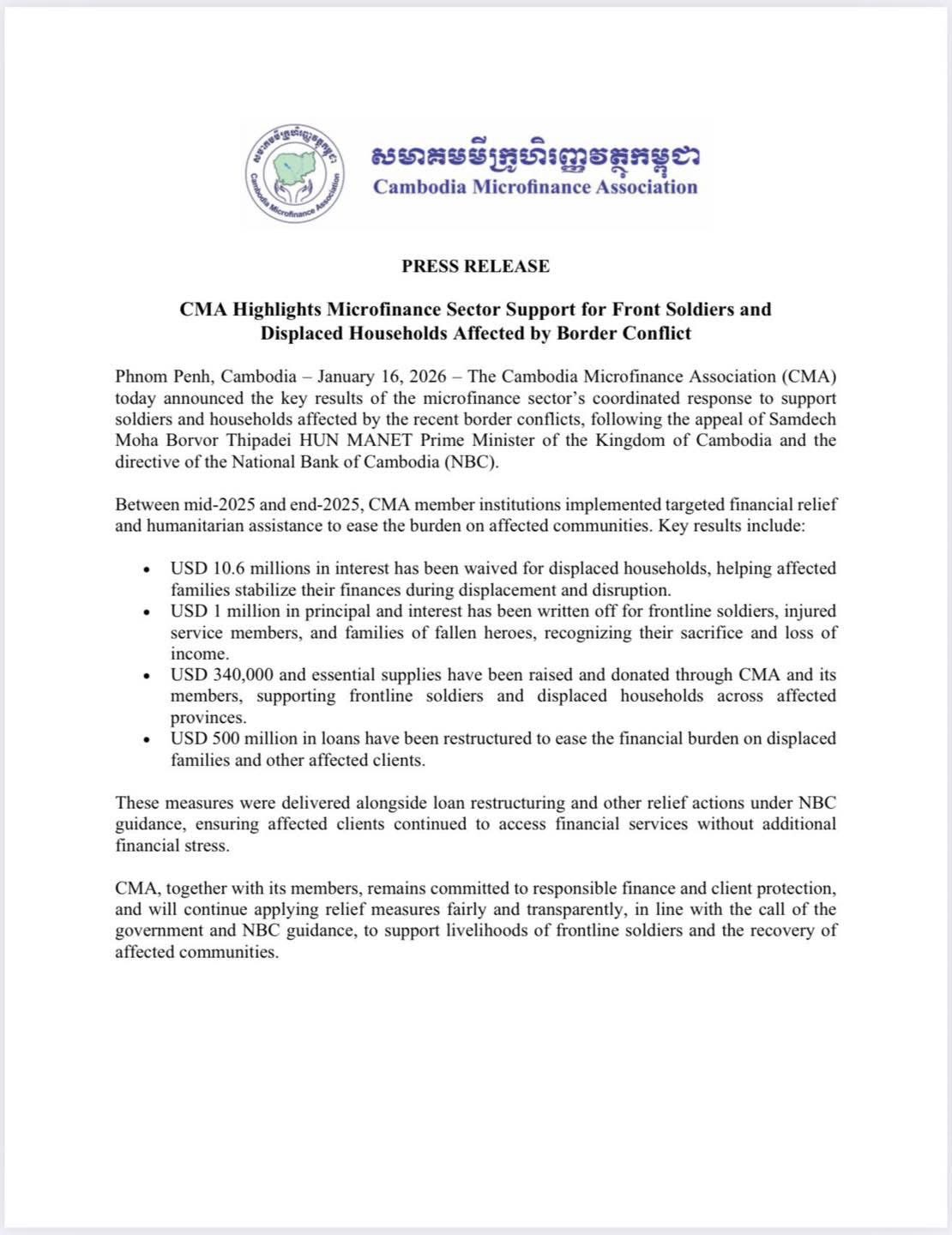 យោងតាម ទូរទស្សន៍ជាតិ ខេត្តបន្ទាយមានជ័យ នាថ្ងៃទីទី១៦ ខែមករា ឆ្នាំ២០២៦ សមាគមមីក្រូហិរញ្ញវត្ថុកម្ពុជា (CMA) បង្ហាញលទ្ធផលសំខាន់ៗនៃកិច្ចសហប្រតិបត្តិការក្នុងវិស័យមីក្រូហិរញ្ញវត្ថុ ដើម្បីគាំទ្រដល់កងទ័ព និងប្រជាពលរដ្ឋដែលរងផលប៉ះពាល់ដោយសារជម្លោះព្រំដែននាពេលថ្មីៗនេះ ដែលឆ្លើយតបទៅនឹងការអំពាវនាវរបស់ សម្តេចមហាបវរធិបតី ហ៊ុន ម៉ាណែត នាយករដ្ឋមន្រ្តីនៃព្រះរាជាណាចក្រកម្ពុជា និងតាមសេចក្តីណែនាំរបស់ធនាគារជាតិនៃកម្ពុជា (NBC)។