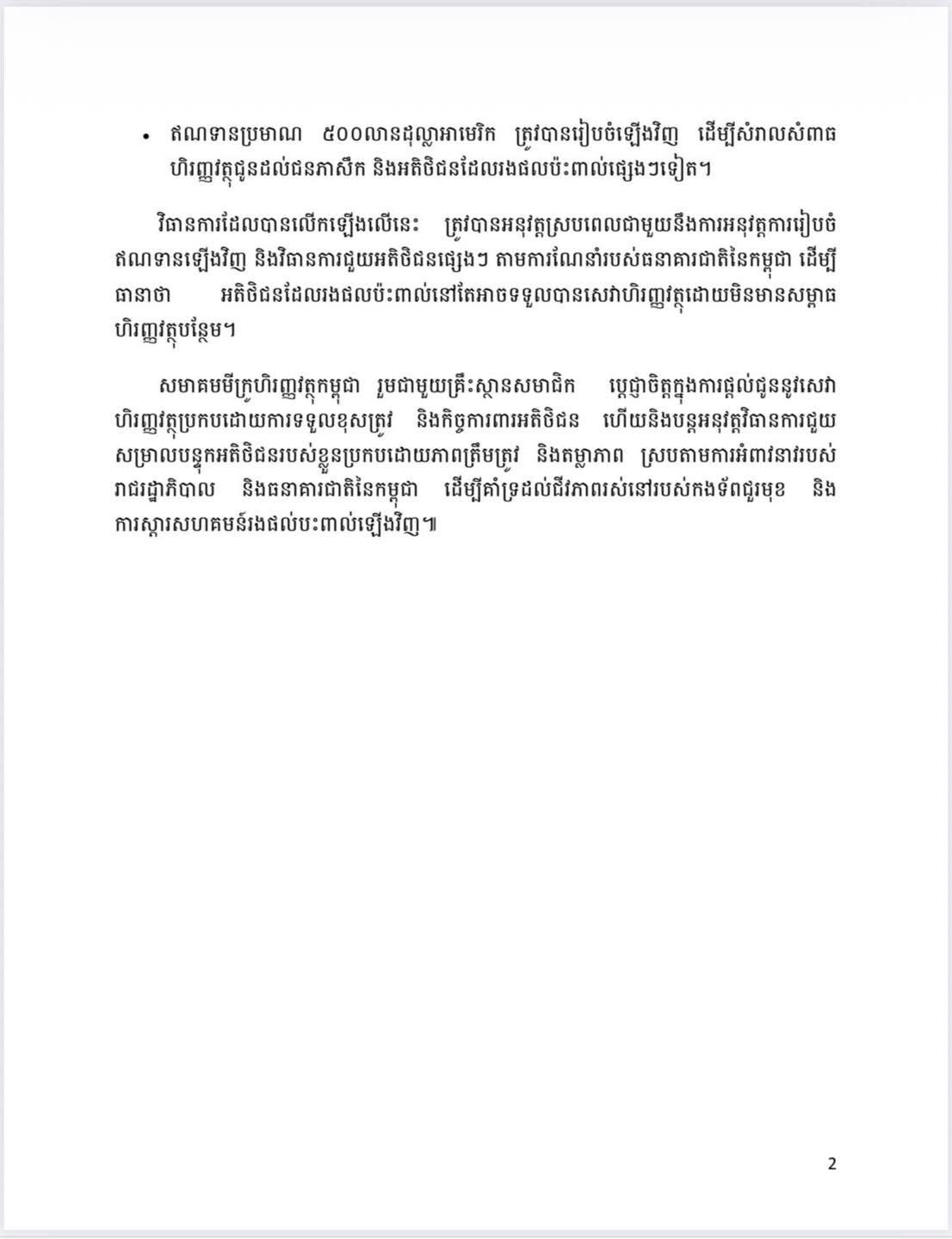 • ឥណទានប្រមាណ ៥០០លានដុល្លាអាមេរិក ត្រូវបានរៀបចំឡើងវិញ ដើម្បីសំរាលសំពាធហិរញ្ញវត្ថុជូនដល់ជនភាសឹក និងអតិថិជនដែលរងផលប៉ះពាល់ផ្សេងៗទៀត។វិធានការដែលបានលើកឡើងលើនេះ ត្រូវបានអនុវត្តស្របពេលជាមួយនឹងការអនុវត្តការរៀបចំឥណទានឡើងវិញ និងវិធានការជួយអតិថិជនផ្សេងៗ តាមការណែនាំរបស់ធនាគារជាតិនៃកម្ពុជា ដើម្បីធានាថា អតិថិជនដែលរងផលប៉ះពាល់នៅតែអាចទទួលបានសេវាហិរញ្ញវត្ថុដោយមិនមានសម្ពាធហិរញ្ញវត្ថុបន្ថែម។