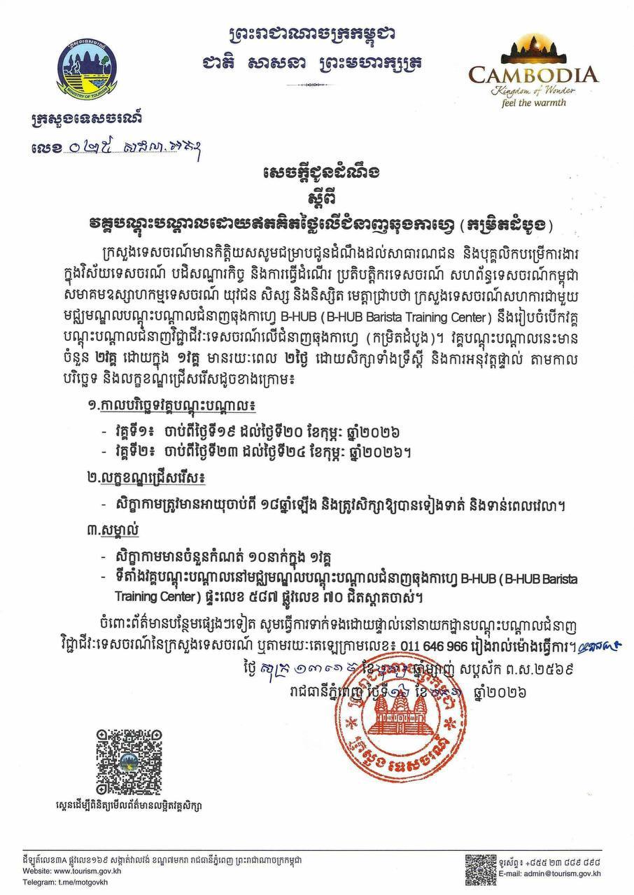 ក្រសួងទេសចរណ៍មានកិត្តិយសសូមជម្រាបជូនដំណឹងដល់សាធារណជន និងបុគ្គលិកបម្រើការងារ ក្នុងវិស័យទេសចរណ៍ បដិសណ្ឋារកិច្ច និងការធ្វើដំណើរ ប្រតិបត្តិករទេសចរណ៍ សហព័ន្ធទេសចរណ៍កម្ពុជា សមាគមឧស្សាហកម្មទេសចរណ៍ យុវជន សិស្ស និងនិស្សិត មេត្តាជ្រាបថា ក្រសួងទេសចរណ៍សហការជាមួយ មជ្ឈមណ្ឌលបណ្តុះបណ្តាលជំនាញឆុងកាហ្វេ BHUB (BHUB Barista Training Center) នឹងរៀបចំបើកវគ្គ បណ្តុះបណ្តាលជំនាញវិជ្ជាជីវៈទេសចរណ៍លើជំនាញឆុងកាហ្វេ (កម្រិតដំបូង)។ វគ្គបណ្តុះបណ្តាលនេះមាន ចំនួន ២វគ្គ ដោយក្នុង ១វគ្គ មានរយៈពេល ២ថ្ងៃ ដោយសិក្សាទាំងទ្រឹស្តី និងការអនុវត្តផ្ទាល់ តាមកាល បរិច្ឆេទ និងលក្ខខណ្ឌជ្រើសរើសដូចខាងក្រោម៖