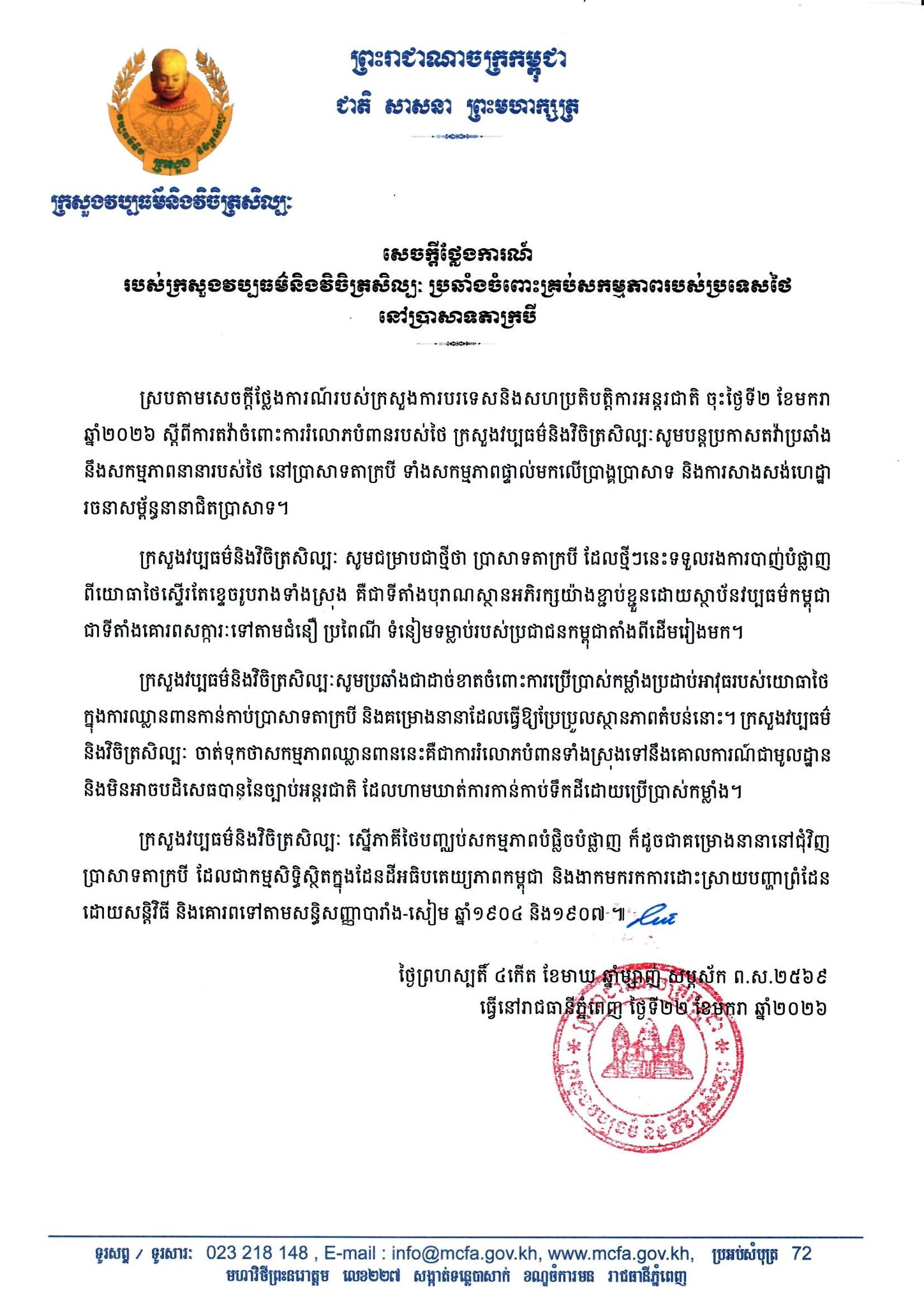 ក្នុងសេចក្ដីថ្លែការរបស់ ក្រសួងវប្បធម៌និងវិចិត្រសិល្បៈ បានបញ្ជាក់ថា ស្របតាមសេចក្តីថ្លែងការណ៍របស់ ក្រសួងការបរទេសនិងសហប្រតិបត្តិការអន្តរជាតិ ចុះថ្ងៃទី ២ ខែមករា ឆ្នាំ ២០២៦ ពី ការតវ៉ាចំពោះការរំលោភបំពានរបស់ថៃ ក្រសួងវប្បធម៌និងវិចិត្រសិល្បៈ សូមបន្តប្រកាសតវ៉ាប្រឆាំង នឹងសកម្មភាពនានារបស់ថៃ នៅប្រាសាទតាក្របី ទាំងសកម្មភាពផ្ទាល់មកលើប្រាង្គប្រាសាទ និងការសាងសង់ហេដ្ឋា រចនាសម្ព័ន្ធនានាជិតប្រាសាទ។