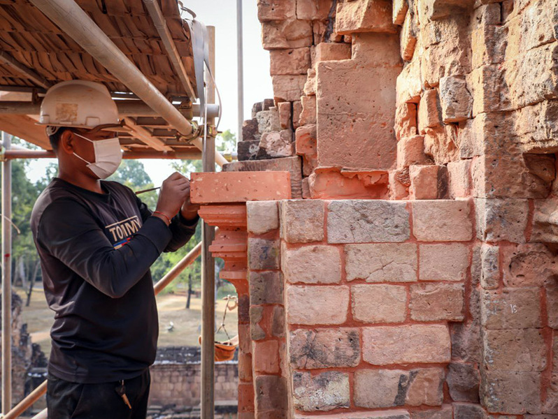 អាជ្ញាធរជាតិអប្សរាកំពុងជួសជុលប៉មឥដ្ឋលេខ១០ និងកម្រាលថ្មបាយក្រៀមនៅជ្រុងនិរតីនៃរួតទី១ ប្រាសាទប្រែរូប