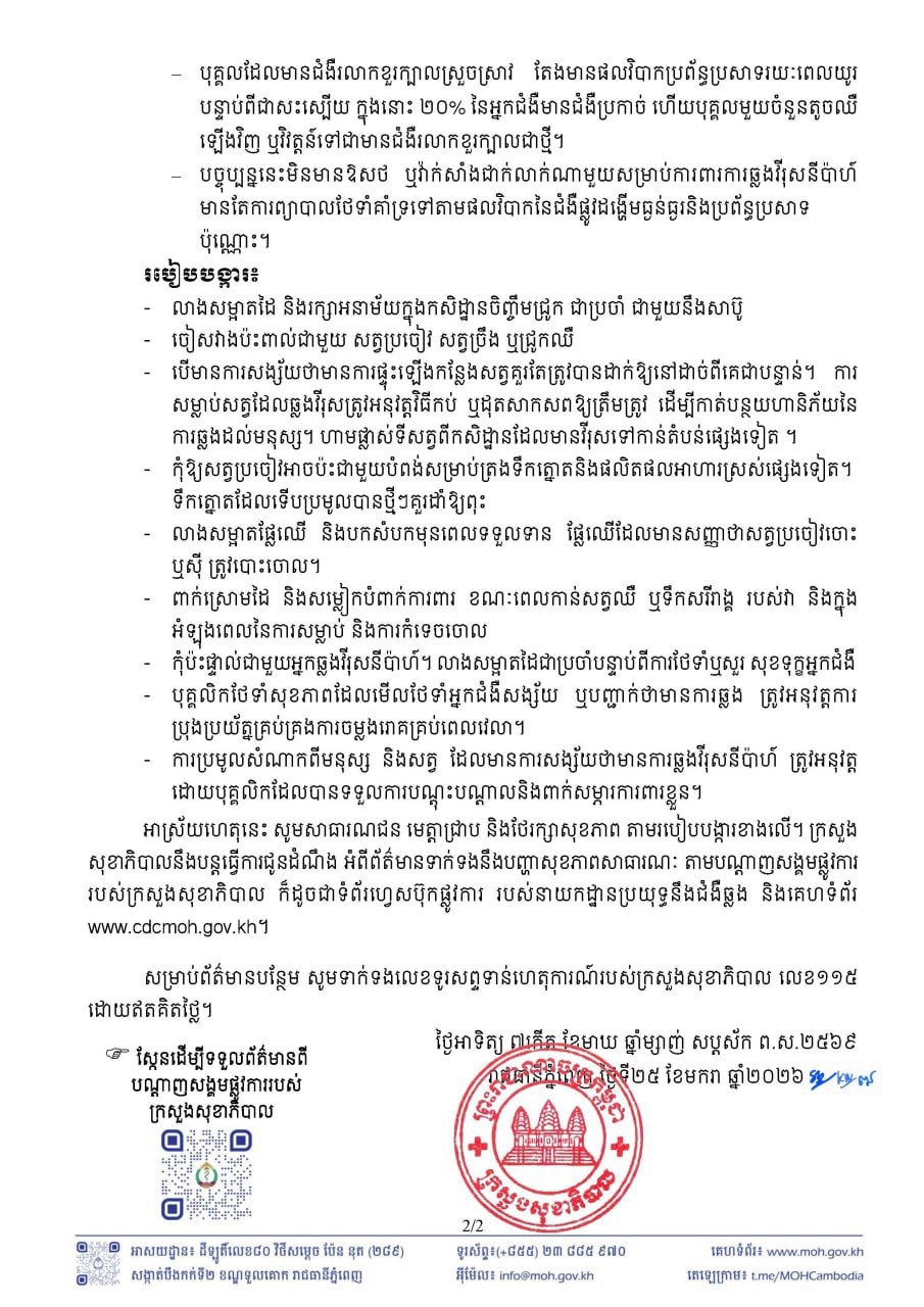 រាជធានីភ្នំពេញ៖ យោងតាមការចុះផ្សាយរបស់ ក្រសួងសុខាភិបាល នៅថ្ងៃទី២៥ ខែមករា ឆ្នាំ២០២៦ បានចេញនូវសេចក្ដីប្រកាសព័ត៌មាន ស្តីពីការការពារខ្លួនពីការឆ្លងវីរុសនីប៉ាហ៍ (Nipah Virus)។