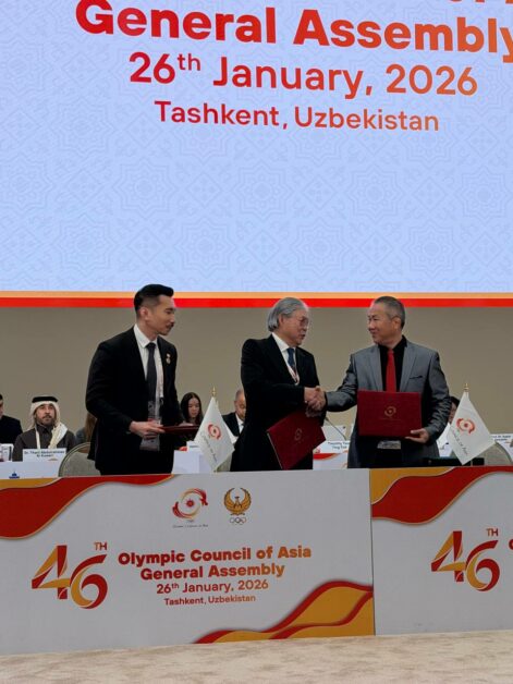 ឯកឧត្តម វ៉ាត់ ចំរើន អគ្គលេខាធិការ តំណាងដ៏ខ្ពង់ខ្ពស់ ឯកឧត្តម ថោង ខុន ប្រធានអូឡាំពិកកម្ពុជា និងឯកឧត្តម សេង វណ្ណៈ អភិបាលរង តំណាងដ៏ខ្ពង់ខ្ពស់ ឯកឧត្តម ឃួន ស្រេង អភិបាលនៃគណអភិបាលរាជធានីភ្នំពេញ បានចុះហត្ថលេខាជាមួយ ឯឧ Timothy Fox ប្រធានស្តីទីក្រុមប្រឹក្សាអូឡាំពិកអាសុី OCA ។