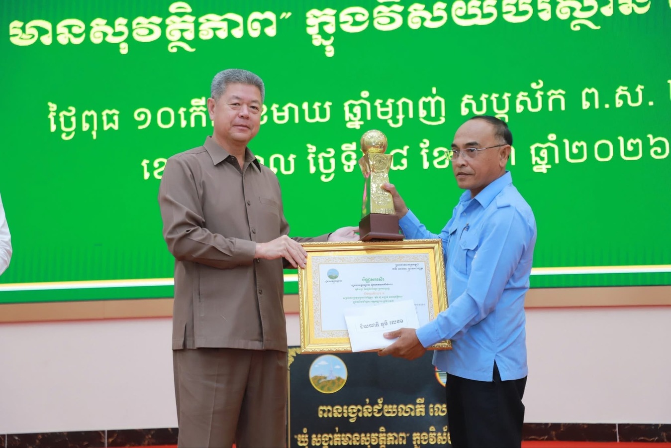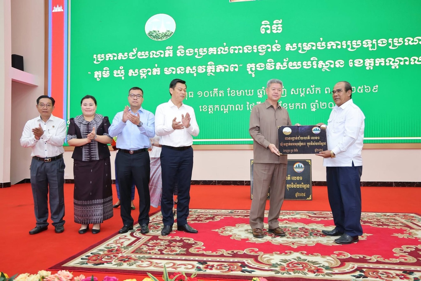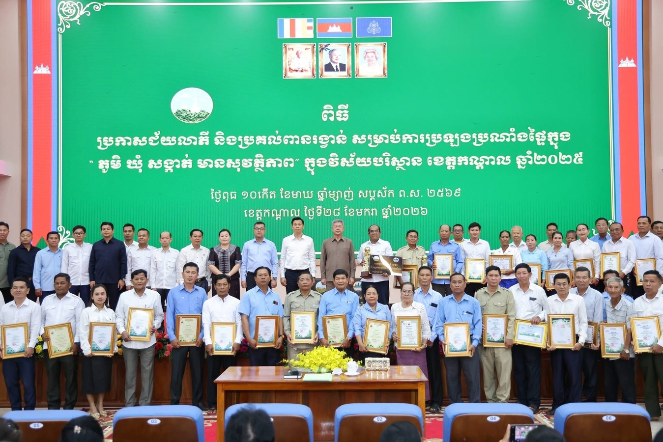 ក្នុងពិធីនេះដែរ ឯកឧត្ដម អភិបាលខេត្ត បានអបអរសារទចំពោះឃុំ-សង្កាត់ ជាប់ជ័យលាភី «ភូមិ ឃុំ សង្កាត់ មានសុវត្ថិភាព» ក្នុងវិស័យបរិស្ថានខេត្តកណ្តាល ឆ្នាំ២០២៥ និងបានកោតសរសើរ វាយតម្លៃខ្ពស់ ចំពោះថ្នាក់ដឹកនាំ មន្ទីរ-អង្គភាព គណៈអភិបាលក្រុង-ស្រុក ឃុំ-សង្កាត់ មេភូមិ ព្រមទាំងក្រុមហ៊ុនប្រមូលសំរាម និងគ្រប់អង្គការសង្គមស៊ីវិល ដែលបានចូលរួមសហការជាមួយរដ្ឋបាលខេត្ត ក្នុងការអនុវត្តគោលនយោបាយ «ភូមិ-ឃុំ-សង្កាត់ មានសុវត្ថិភាព» ជាពិសេស ក្នុងវិស័យបរិស្ថាន ដោយផ្អែកលើលក្ខណៈសម្បត្តិទី៦ គឺ «មានអនាម័យ មានសោភណភាពល្អ និងបរិស្ថានល្អ»។