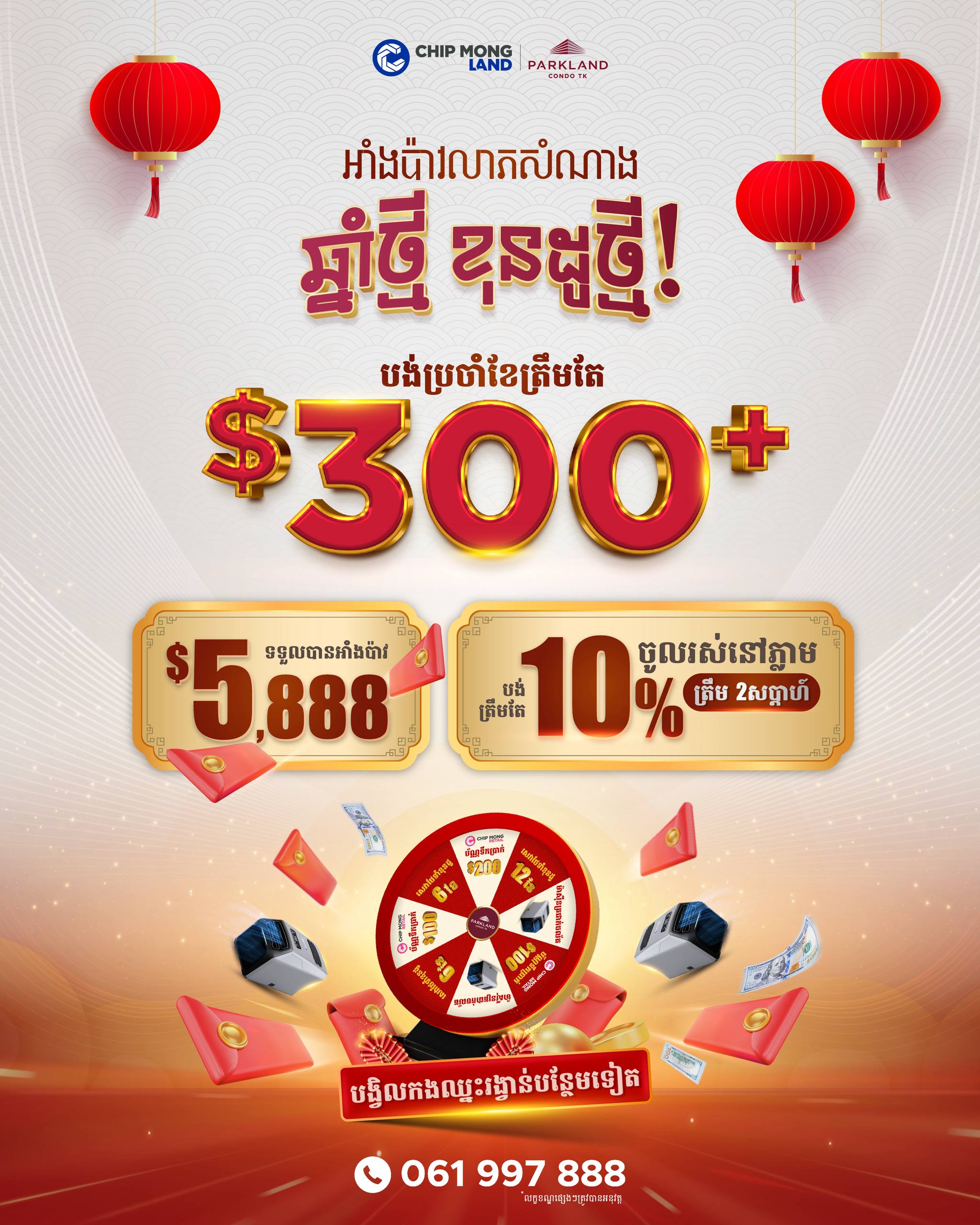 ឱកាសពិសេសដែលមិនគួរមើលរំលង! នាពិធីបុណ្យចូលឆ្នាំចិនខាងមុខនេះParkland Condo TK ដែលជាខុនដូអភិវឌ្ឍដោយជីប ម៉ុង លែន មានកិត្ដិយសនាំមកនូវប្រូម៉ូសិន សម្រាប់ការវិនិយោគដ៏ឆ្លាតវៃ ជាមួយទីតាំងយុទ្ធសាស្រ្តដ៏ល្អឥតខ្ចោះ។