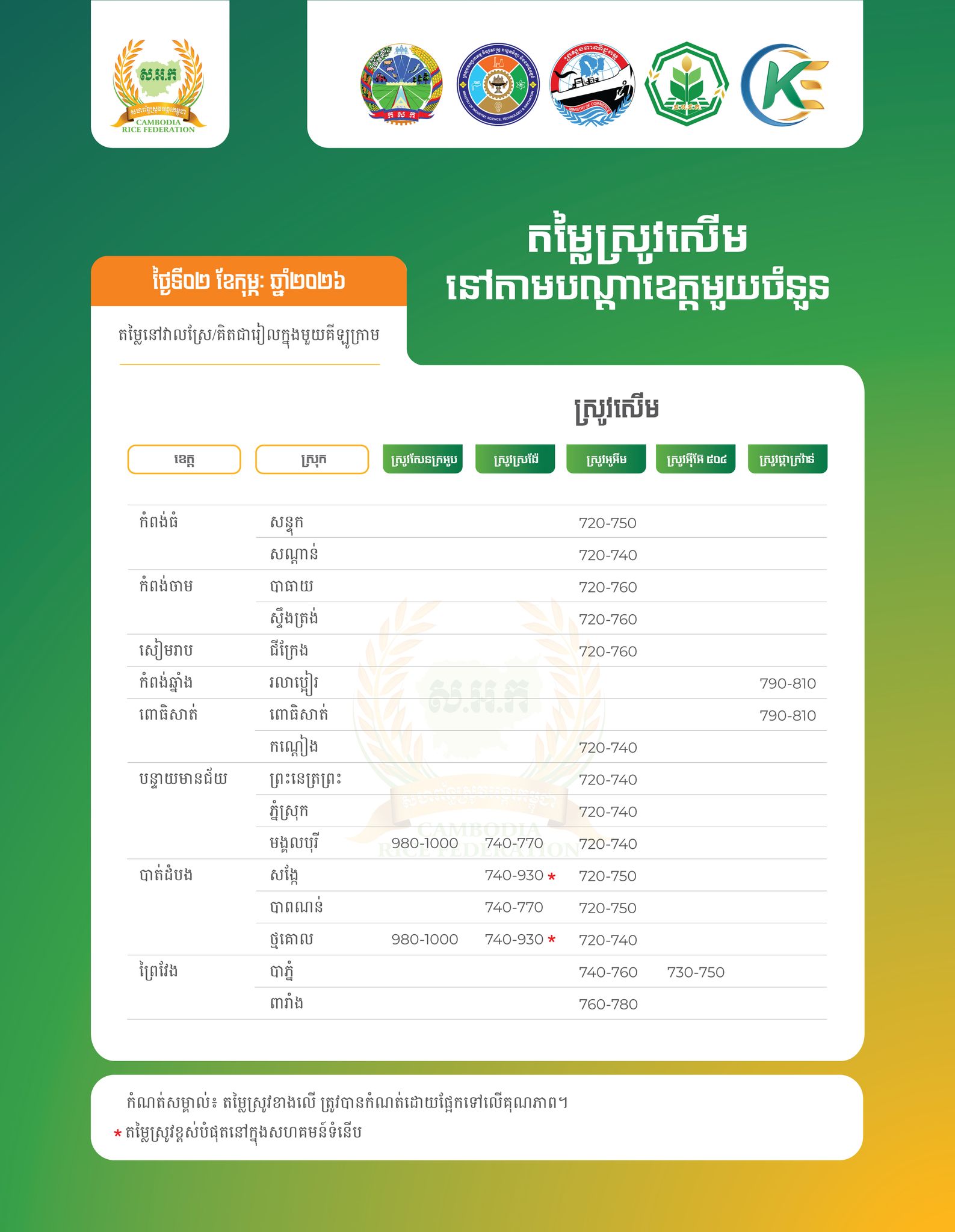 (រាជធានីភ្នំពេញ)៖ យោងតាមកាចុះផ្សាយរបស់ ក្រសួងព័ត៌មាន នៅថ្ងៃទី ៣ ខែកុម្ភៈ ឆ្នាំ ២០២៦ នេះ សហព័ន្ធស្រូវអង្ករកម្ពុជា បង្ហាញតម្លៃទិញស្រូវសើមនៅដើមសប្តាហ៍នេះ ដោយបានឱ្យដឹងថា បណ្តារោងម៉ាស៊ីនកិនស្រូវនៅក្នុងសហព័ន្ធ កាលពីថ្ងៃទី ២ ខែកុម្ភះឆ្នាំ ២០២៦ បាន ចុះទិញស្រូវប្រជាកសិករដល់វាលស្រែជាស្រូវសើមក្នុងតម្លៃដែលផ្អែកលើគុណភាព។ ដូចជាបានចុះទិញស្រូវអូអ៊ឹម នៅស្រុកសន្ទុកខេត្តកំពង់ធំ ក្នុងតម្លៃ៧២០ទៅ៧៥០រៀល និងនៅស្រុកសណ្តាន់ខេត្តកំពង់ធំ ក្នុងតម្លៃ ៧២០ ទៅ ៧៤០រៀល។
