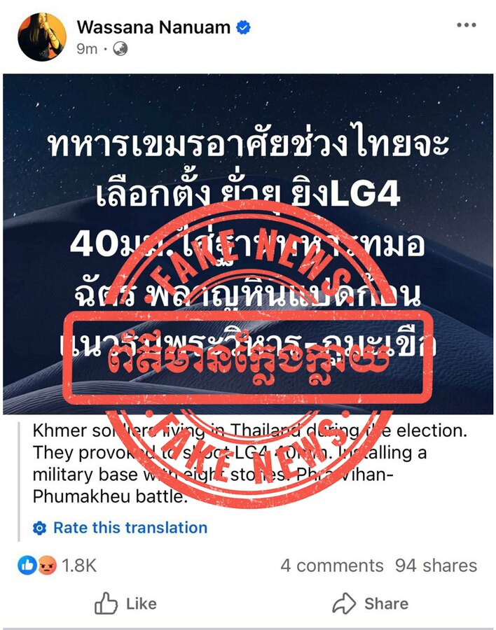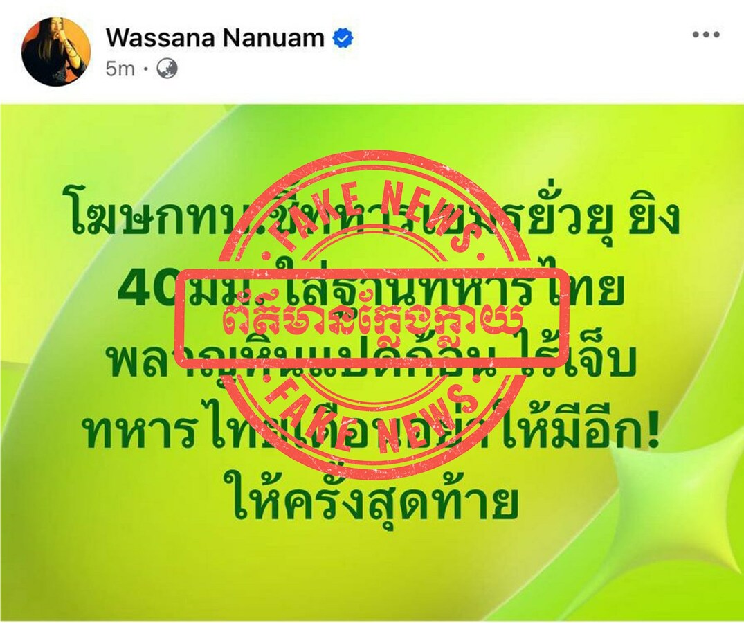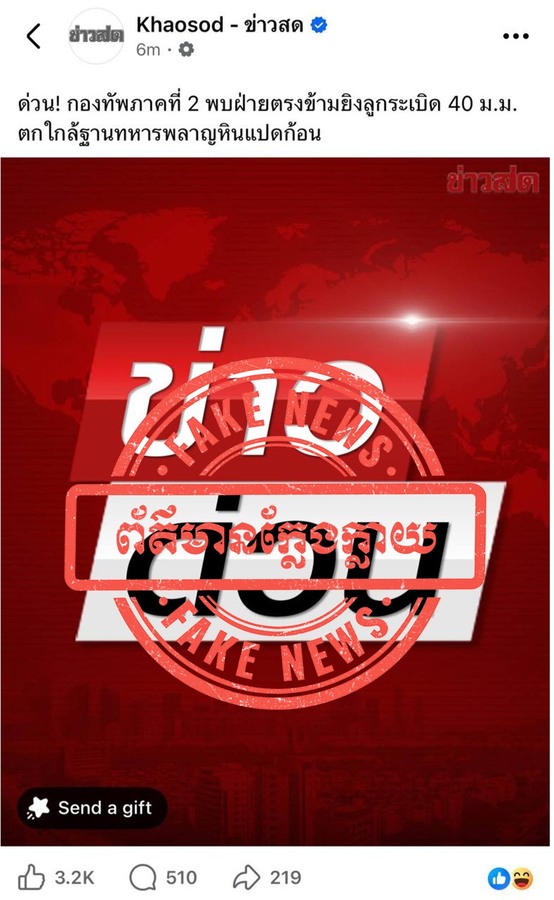 អ្នកនាំពាក្យក្រសួងការពារជាតិ នៃព្រះរាជាណាចក្រកម្ពុជា បានធ្វើការបដិសេធចោលទាំងស្រុងនូវការចុះផ្សាយរបស់បណ្តាញសារព័ត៌មានថៃខាងលើ និងសូមអះអាងថាជាព័ត៌មានប្រឌិត ក្លែងក្លាយផ្ទុយពីការពិតទាំងស្រុង ក្នុងគោលបំណងបំភាន់ដល់សាធារណមតិ និងធ្វើឱ្យស្ថានការណ៍នៅតាមបណ្តោយព្រំដែនកម្ពុជា-ថៃ មានភាពតានតឹង។