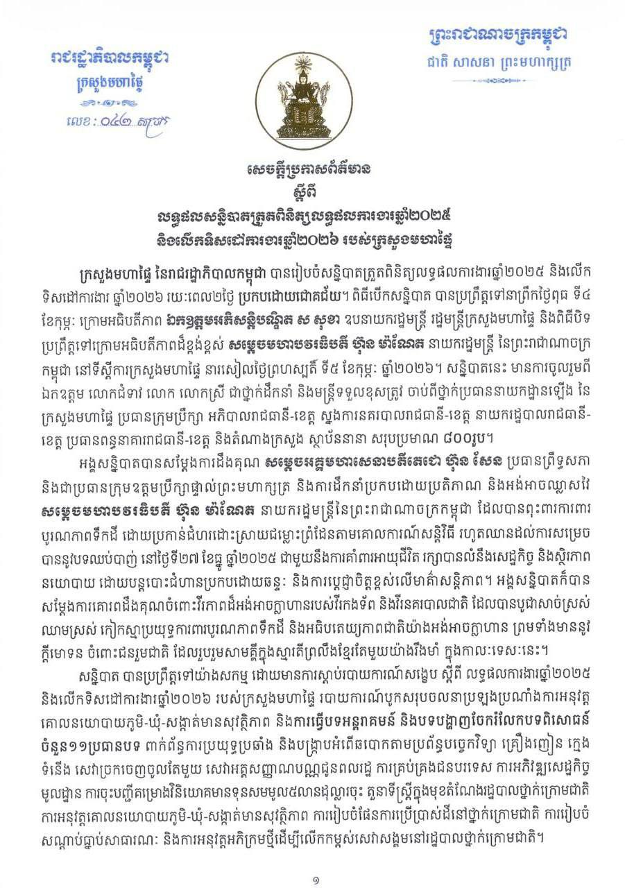 (រាជធានីភ្នំពេញ)៖ តាមការចអផ្សាយរបស់ អគ្គនាយកដ្ឋានវិទ្យុជាតិកម្ពុជា នៅថ្ងៃទី ៦ ខែកុម្ភៈ ឆ្នាំ ២០២៦ នេះ សម្តេចធិបតី ហ៊ុន ម៉ាណែត នាយករដ្ឋមន្ត្រីកម្ពុជា បានសង្កត់ធ្ងន់ពីភាពចាំបាច់នៃការបង្ក្រាបឱ្យបានម៉ឺងម៉ាត់ រាល់បទល្មើសប្រឈមក្នុងសង្គម រួមមាន បទល្មើសឆបោកតាមប្រព័ន្ធបច្ចេកវិទ្យាបទល្មើសចរាចរណ៍ គ្រឿងញៀន ក្មេងទំនើង និងអំពើជួញដូរមនុស្សជាដើម។ សម្តេចធិបតីថ្លែងបែបនេះ ក្នុងសន្និបាតត្រួតពិនិត្យលទ្ធផលការងារឆ្នាំ២០២៥ និងលើកទិសដៅការងារឆ្នាំ ២០២៦ របស់ក្រសួងមហាផ្ទៃ នារសៀលថ្ងៃទី ៥ ខែកុម្ភៈ ឆ្នាំ ២០២៦។