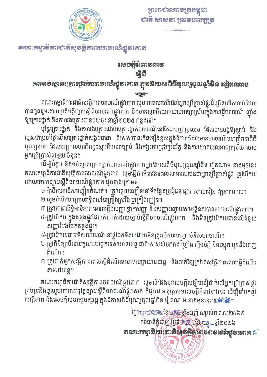 នាថ្ងៃទី ១៤ ខែកុម្ភ: ឆ្នាំ ២០២៦ នេះបានឱ្យដឹងថា គណៈកម្មាធិការជាតិសុវត្ថិភាពចរាចរណ៍ផ្លូវគោក សូមកោតសរសើរដល់អ្នកប្រើប្រាស់ផ្លូវដ៏ច្រើនលើសលប់ ដែល បានចូលរួមគោរពប្រតិបត្តិច្បាប់ស្តីពីចរាចរណ៍ផ្លូវគោក និងមានស្មារតីយោគយល់អាធ្យាស្រ័យក្នុងការធ្វើចរាចរណ៍ ញ៉ាំង ឱ្យគ្រោះថ្នាក់ និងភាពរងគ្រោះបានថយចុះ នាឆ្នាំ២០២៥ កន្លងទៅ។